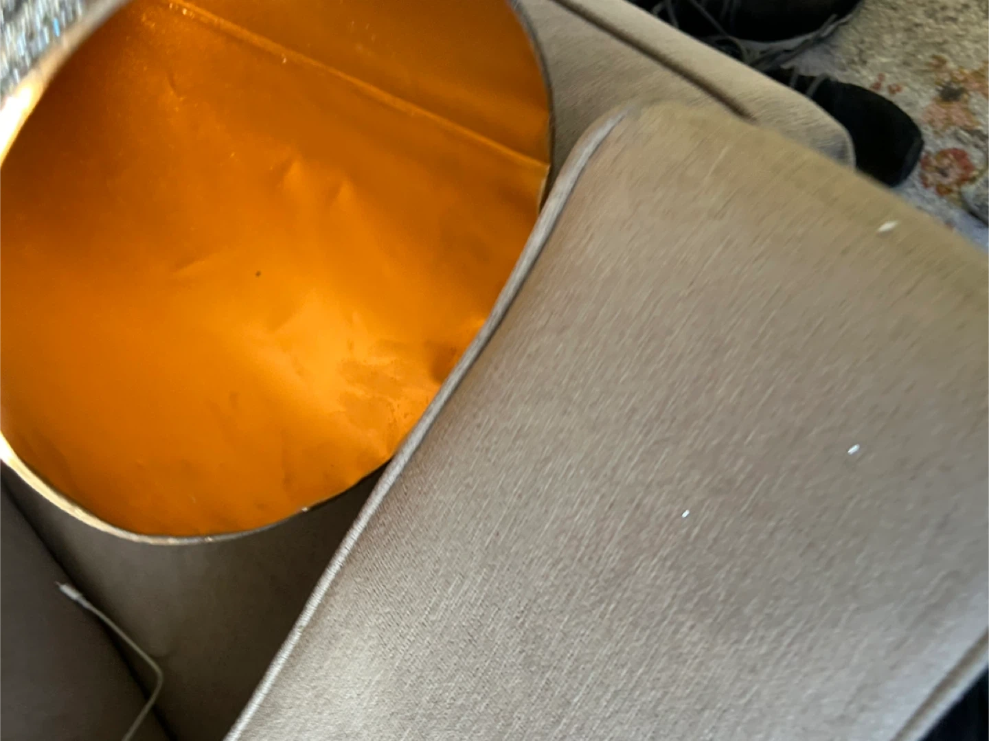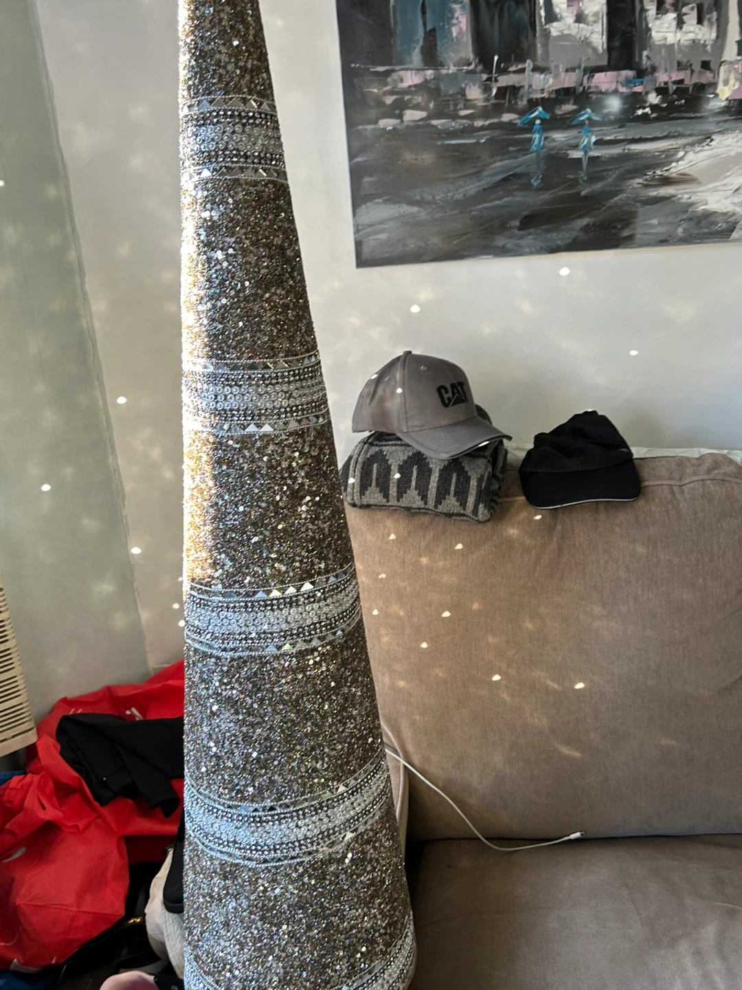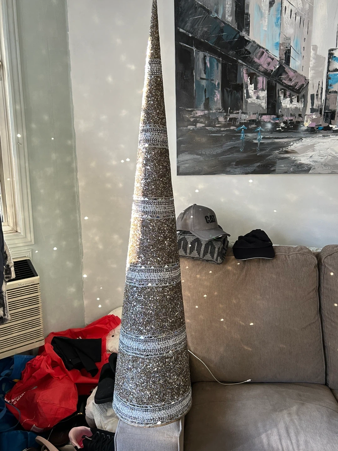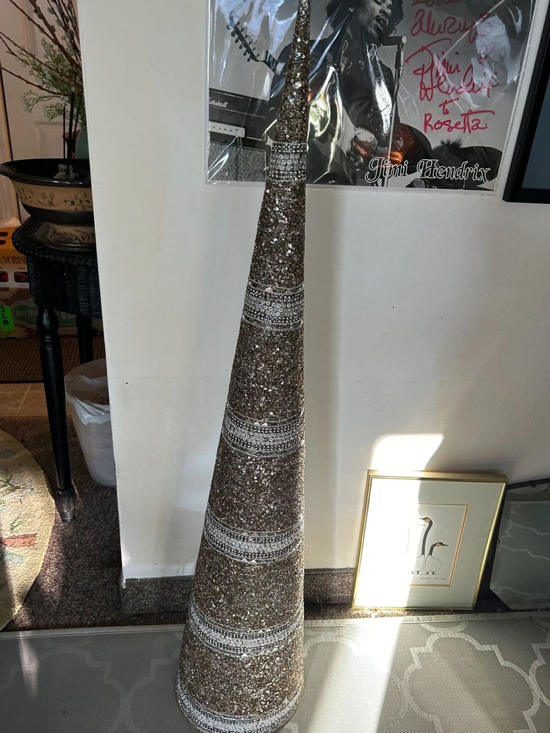 This eye-catching floor boasts a unique cone shape covered in shimmering beads and sequins. It features decorative bands of rhinestones and metallic trim. It's a striking piece that adds glamour to any room!