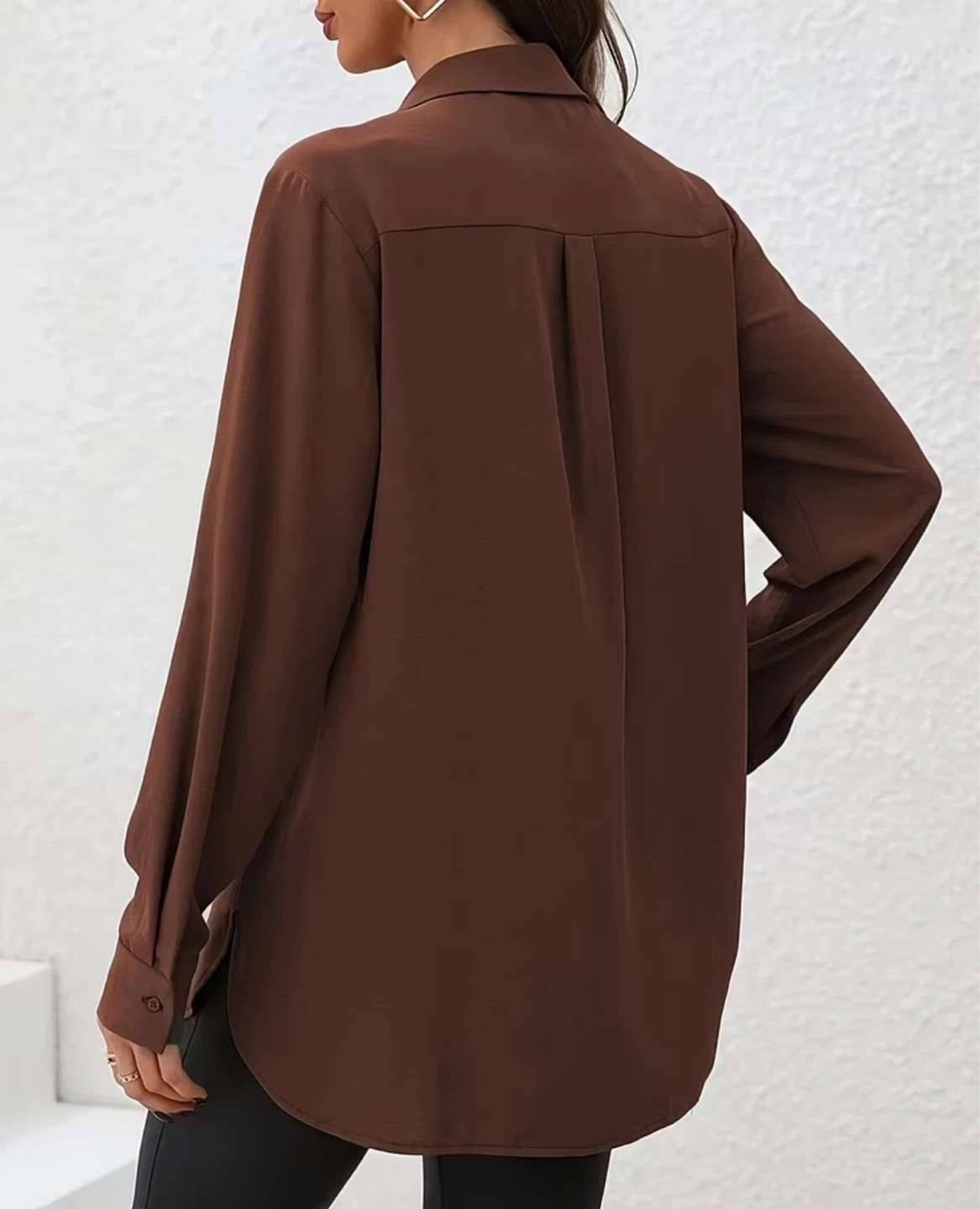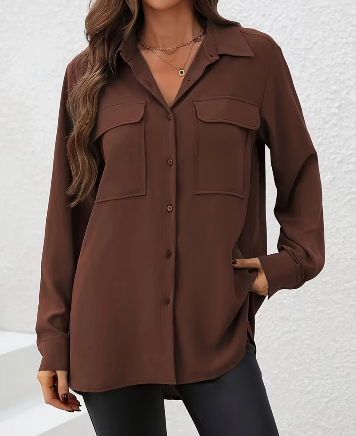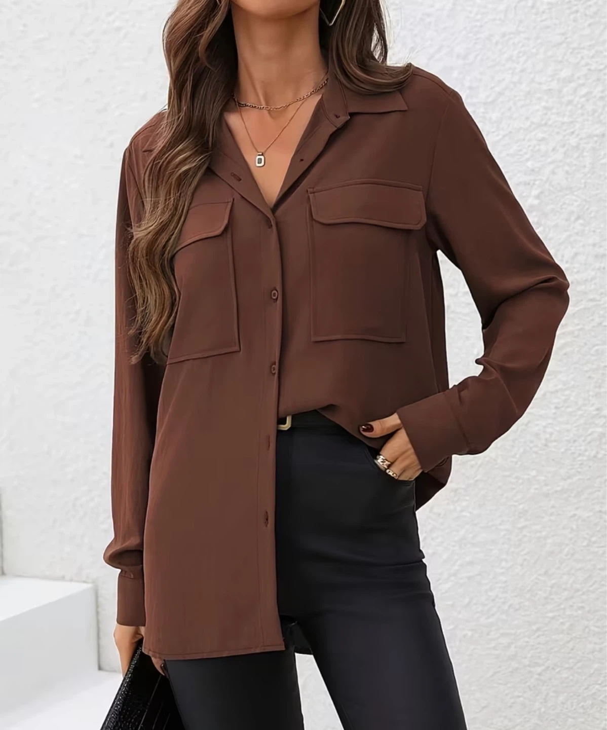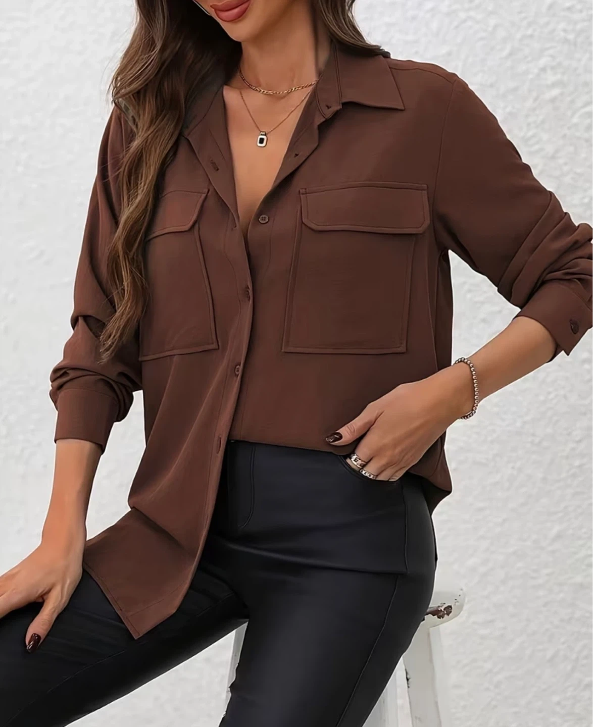 Chemise boutonnée couleur marron avec deux poches sur le devant. Manches longues avec poignets boutonnés. Matière légère. Parfaite pour un style décontracté chic.