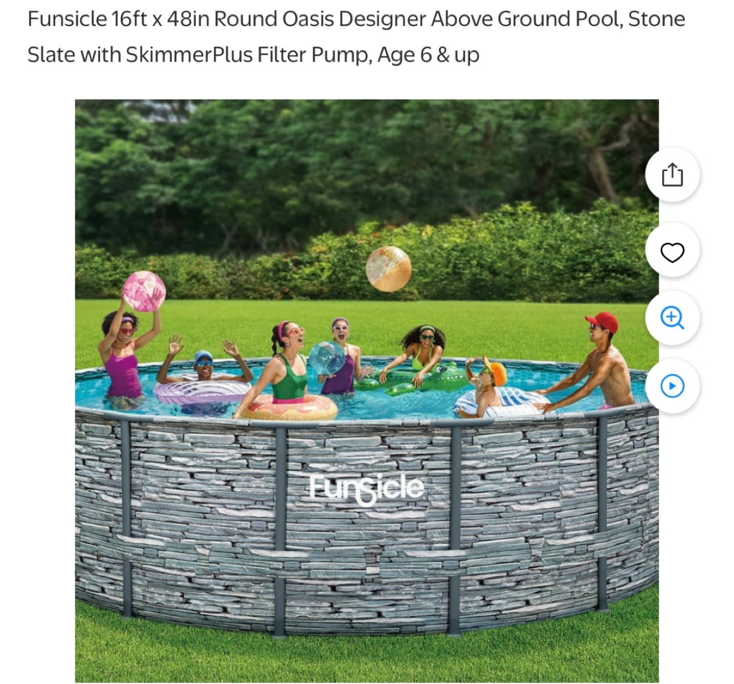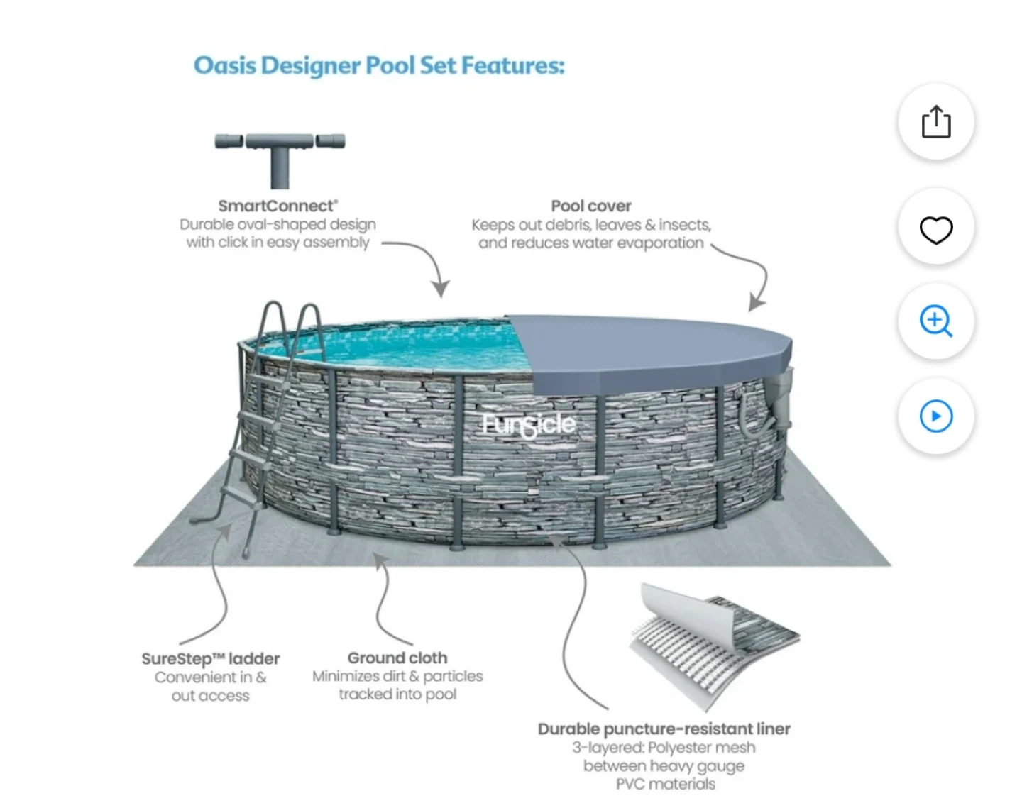This Funsicle pool features a stone slate design and comes with a SkimmerPlus filter pump. It's 16ft in diameter and 48in tall. Includes a ground cloth and SureStep ladder for convenient access. The durable puncture-resistant liner is made of polyester mesh.