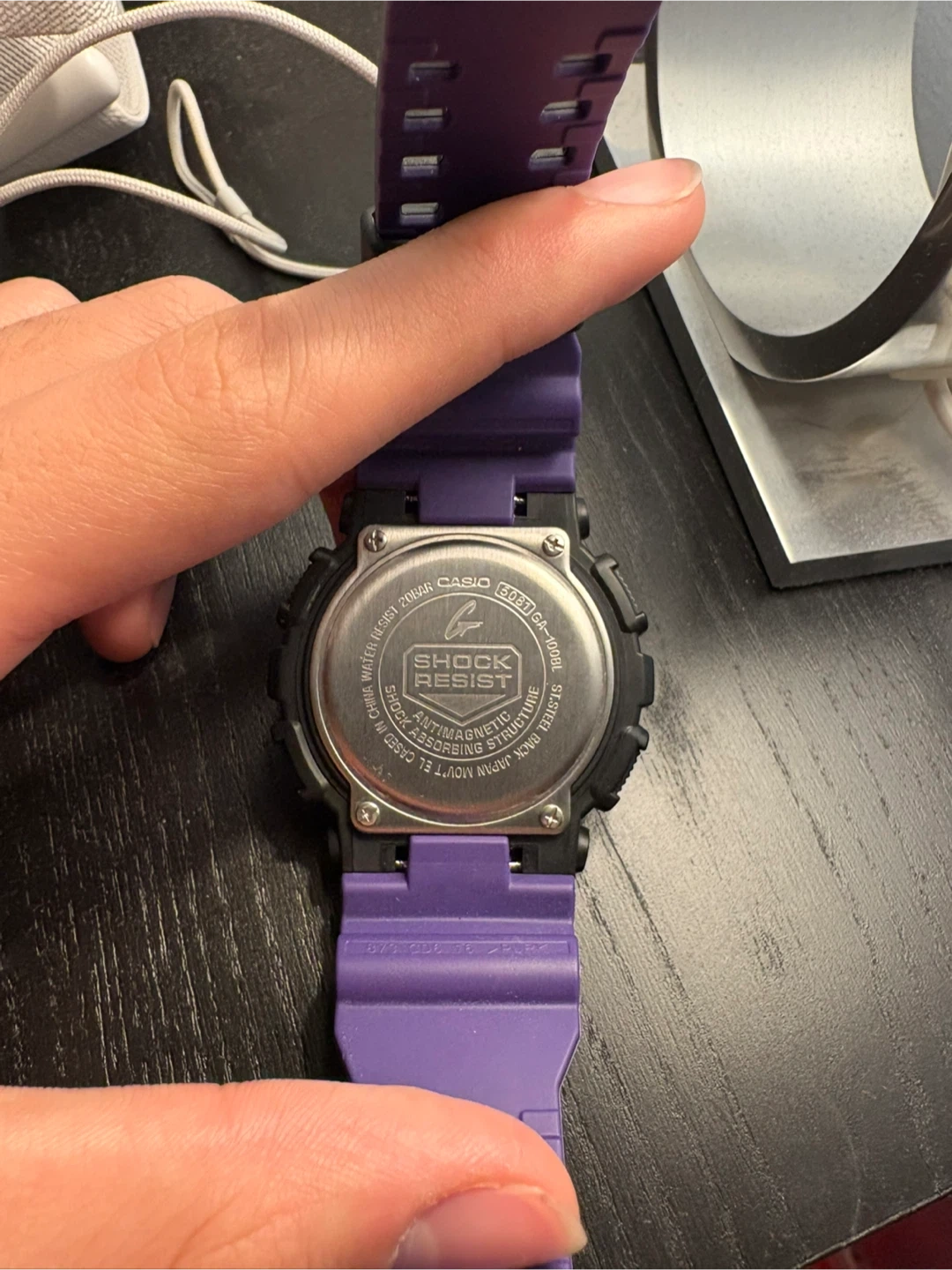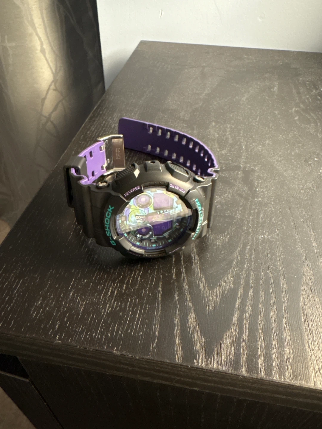 This is a Casio G-Shock GA-100 watch with a black and purple colour scheme. It features shock resistance and anti-magnetic properties. Its durable construction makes it suitable for active lifestyles.