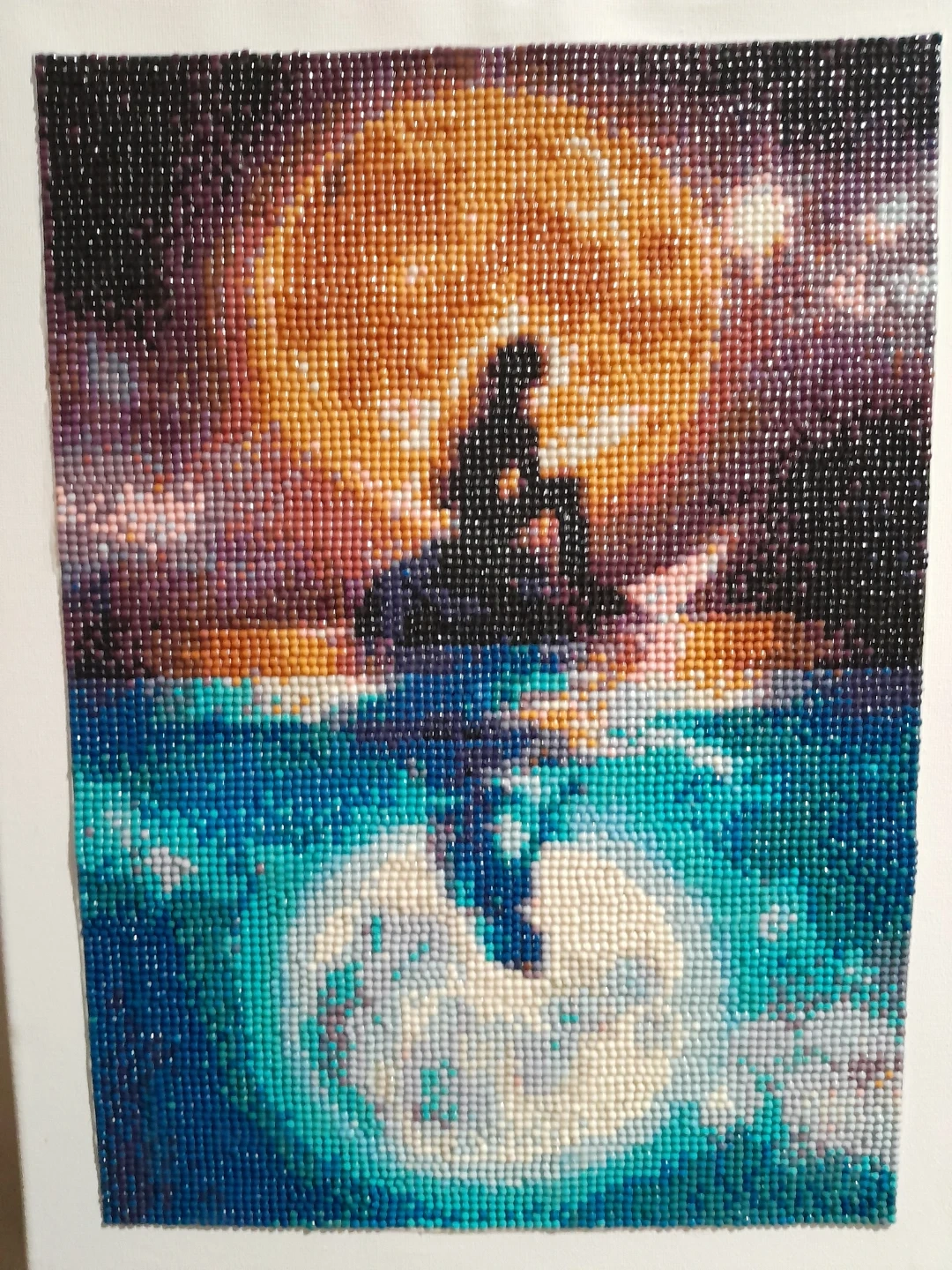 A completed diamond painting featuring a silhouette of a person sitting on a rock, with a large moon in the sky and its reflection in the water. It's made of small, colourful resin drills.