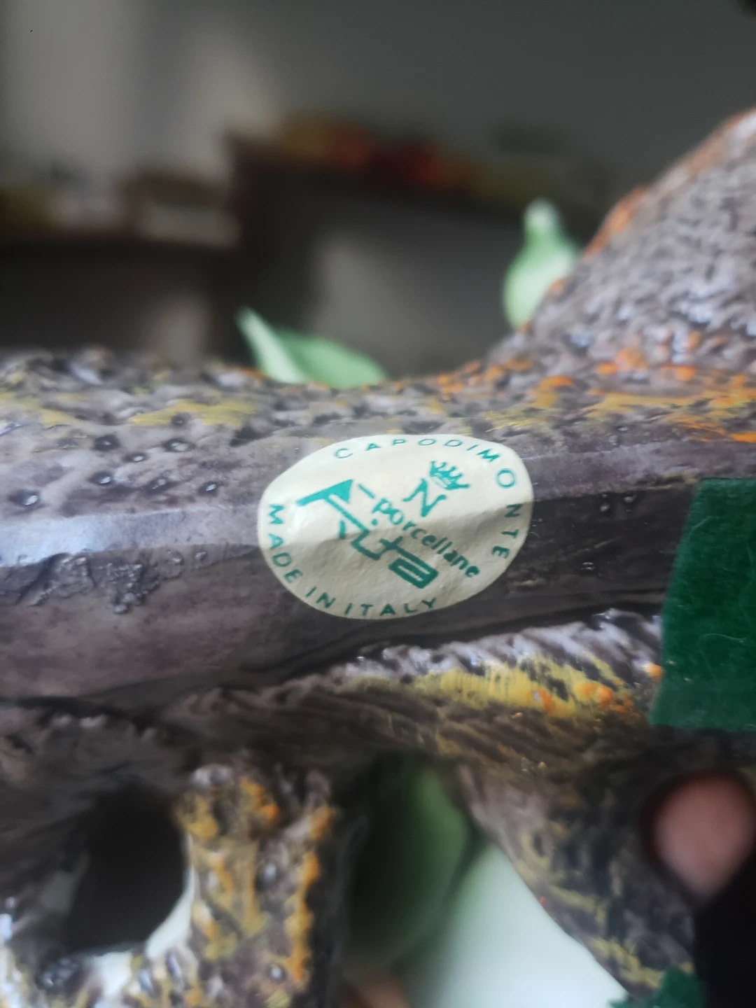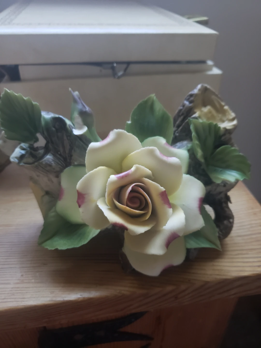 Capodimonte porcelain sculpture featuring a delicate rose with leaves and wood accents. Made in Italy. This piece showcases fine craftsmanship.