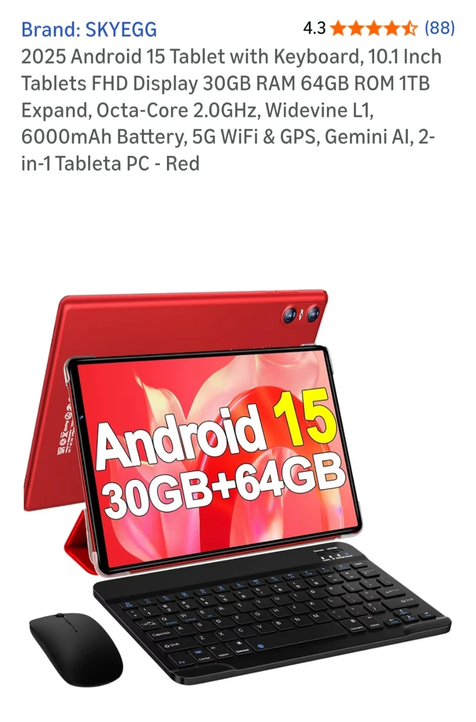 Selling a SKYEGG 2025 Android 15 Tablet in red! This 2-in-1 Tableta PC comes with a keyboard and features a 10.1 inch FHD display, 30GB RAM, 64GB ROM (expandable to 1TB), an Octa-Core 2.0GHz processor, Widevine L1, a 6000mAh battery, 5G WiFi, and GPS. It also has Gemini AI