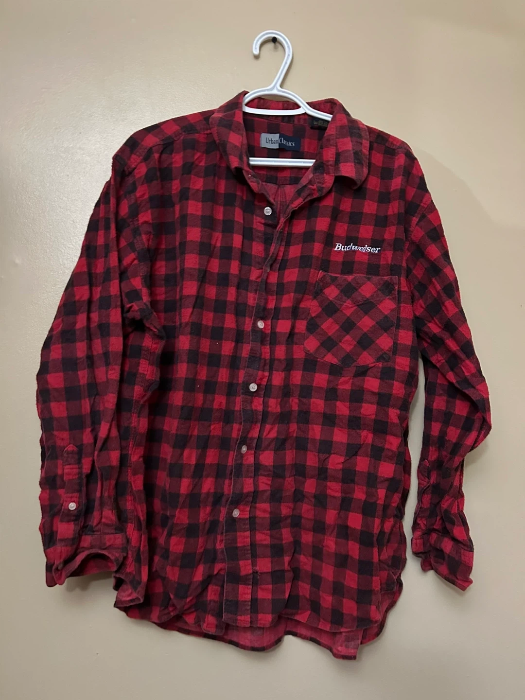 This is a red and black plaid Urban Star Budweiser flannel shirt, perfect for casual wear. It's never been worn but does not have tags.
