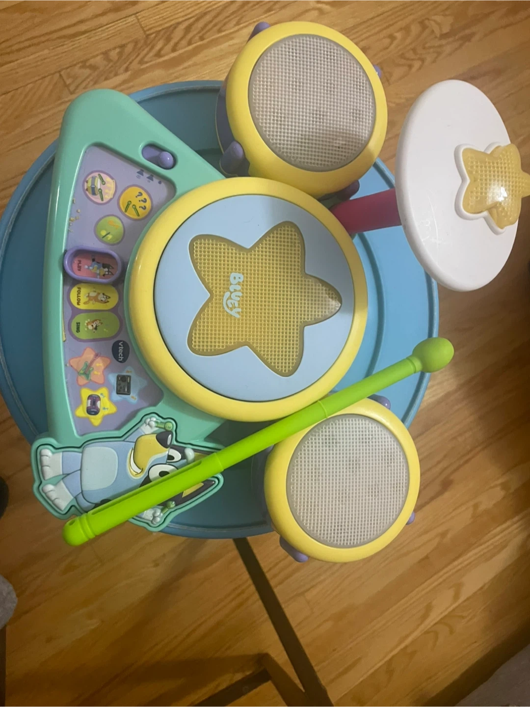 Check out this VTech Bluey's Sing & Discover Drum Set! It's perfect for little ones who love music and Bluey. It's in great shape and ready for a new musician to enjoy!