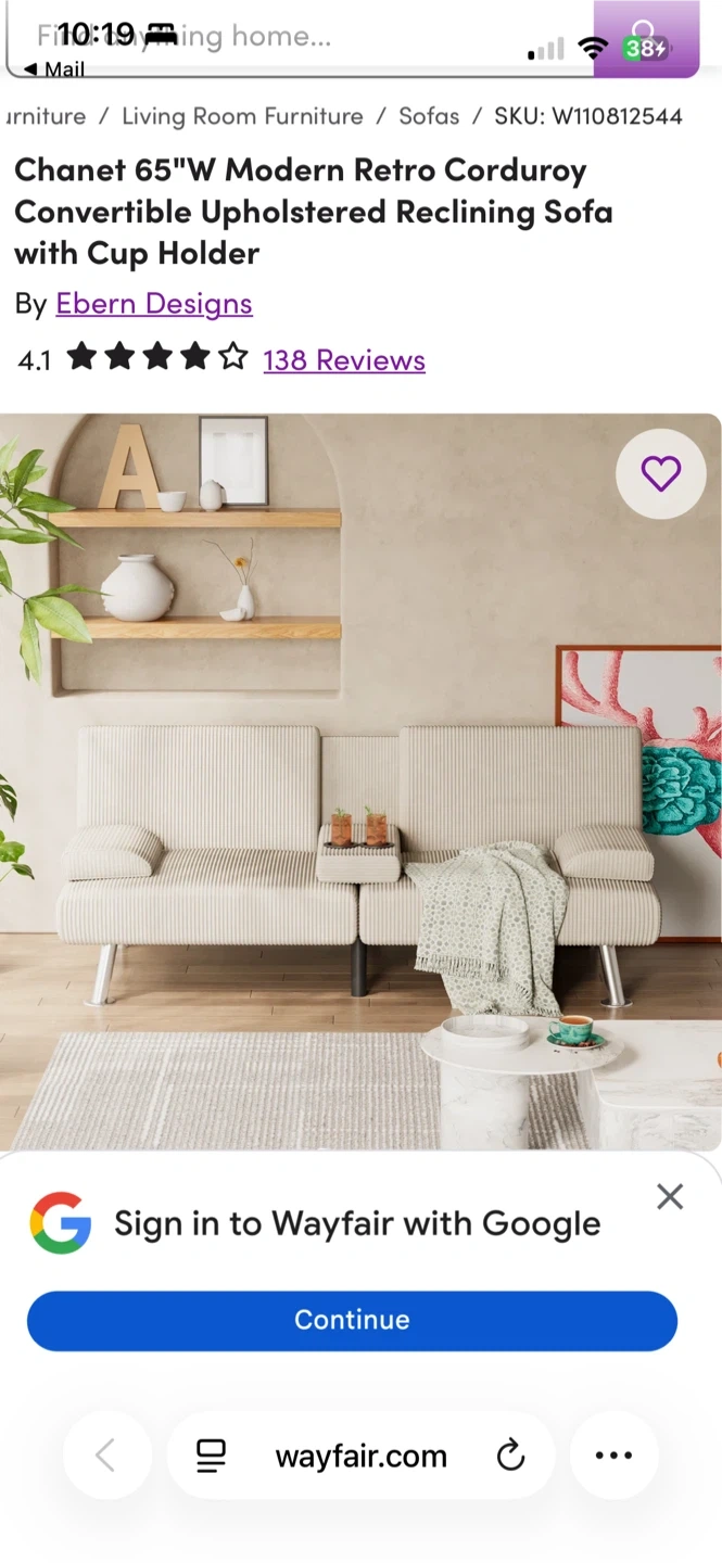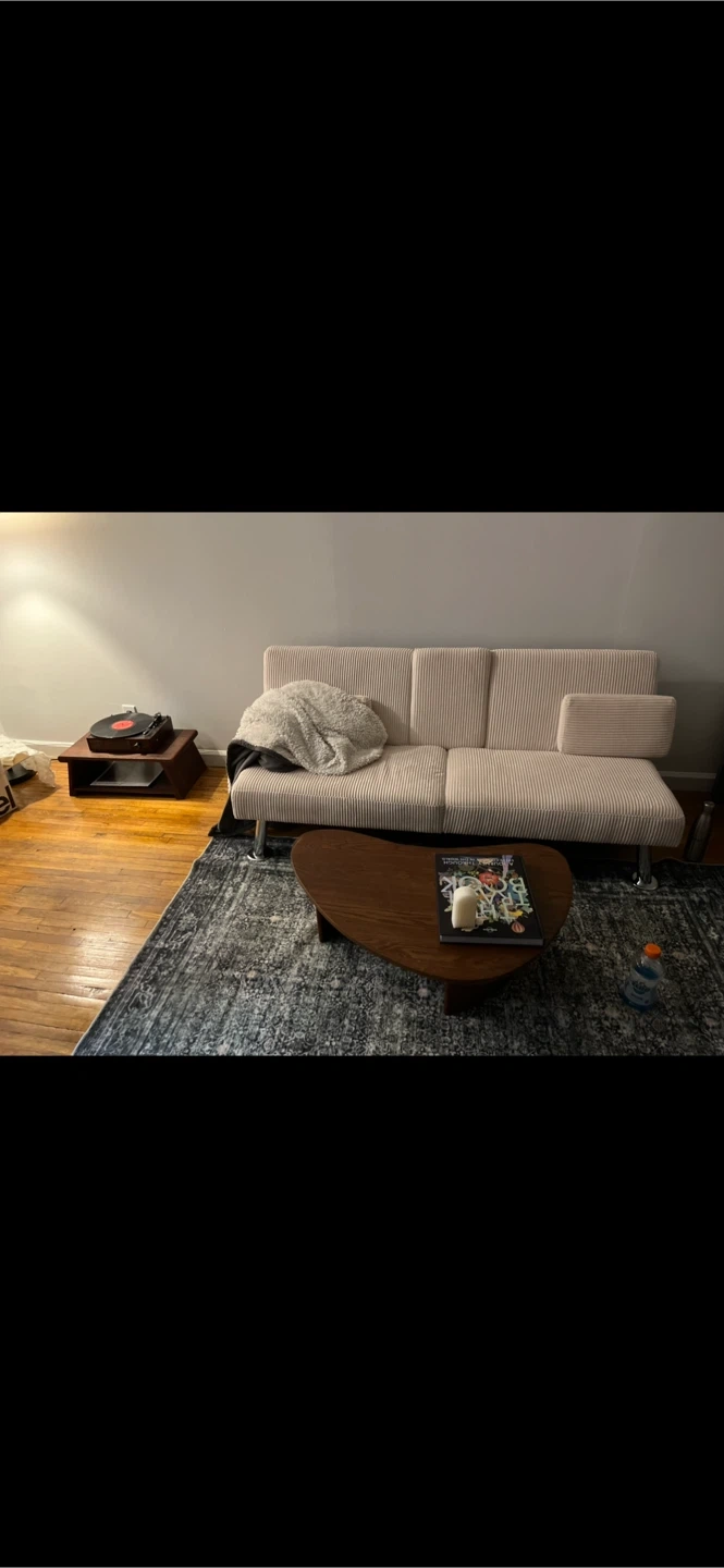 Like new. This is the Chanet 65" sofa by Ebern Designs. It's upholstered in corduroy and features a modern retro style. The sofa converts and reclines, with a convenient cup holder included. It's a comfortable and stylish addition to any living room!