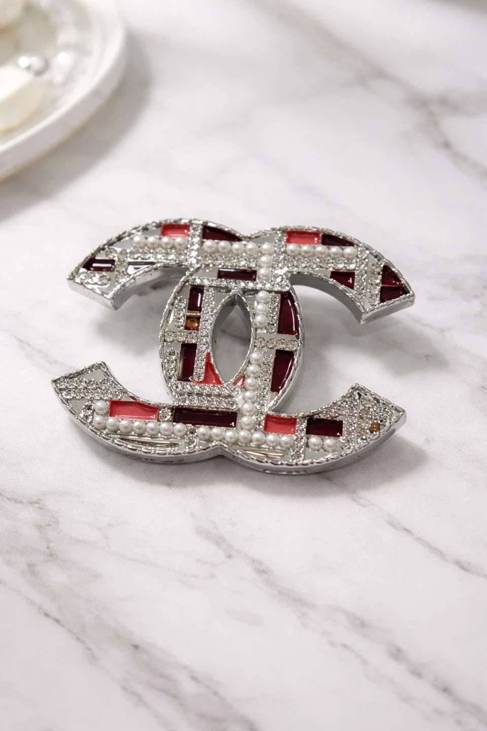 This Chanel brooch features the iconic CC logo. It's embellished with faux pearls, colorful enamel insets, and clear crystals. A stunning accessory to elevate any outfit!