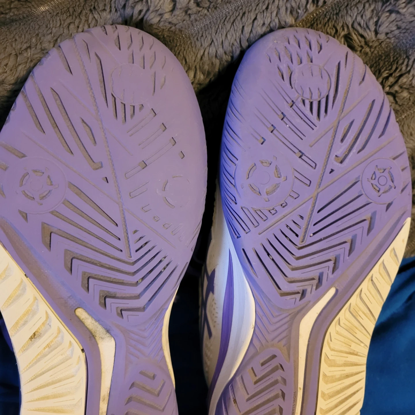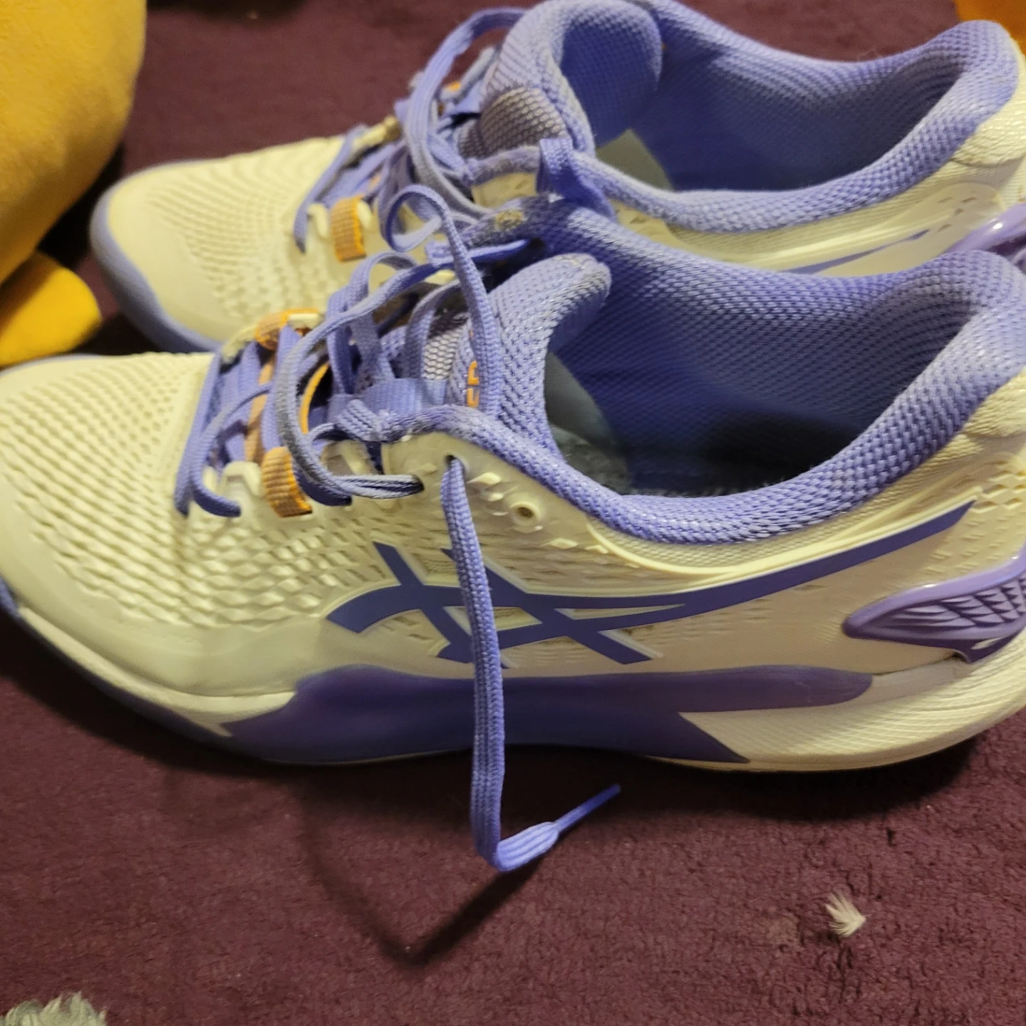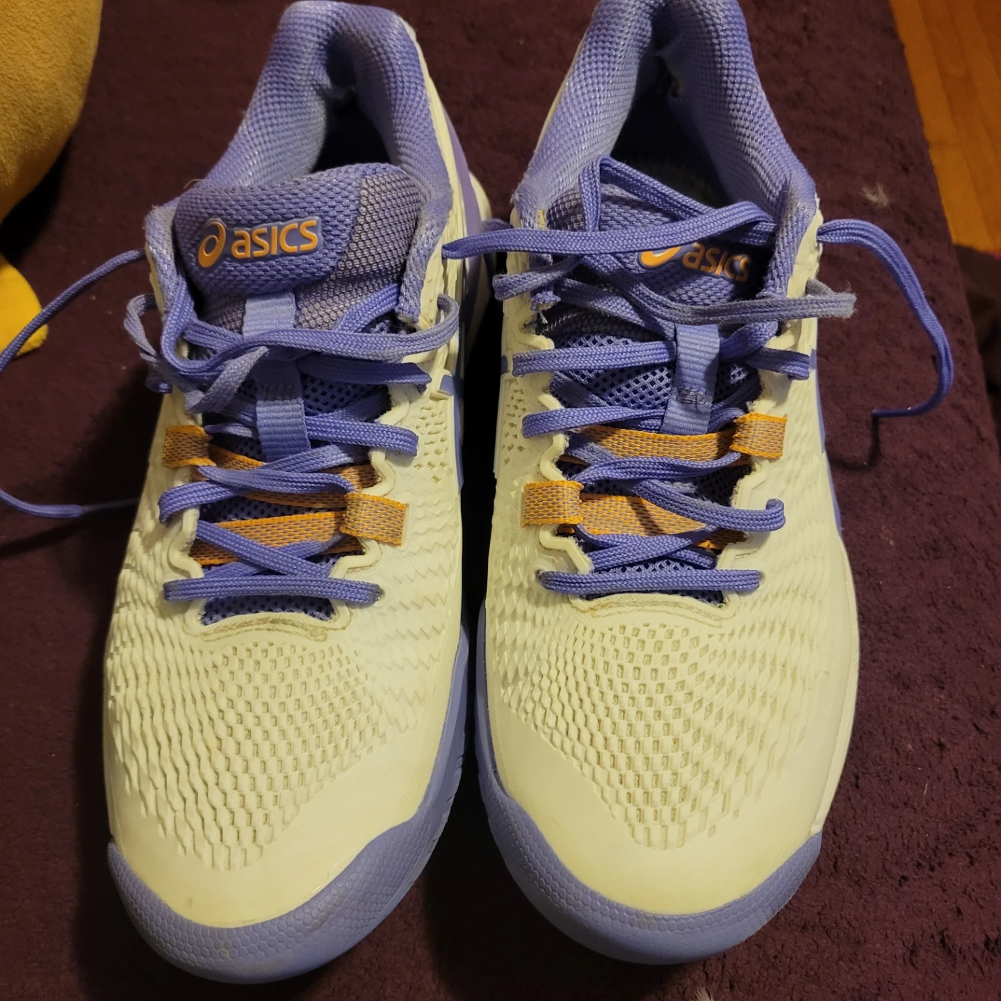 These Asics Revolution tennis shoes are a size 8 US (39.5 EUR). They're white with purple and orange accents. Made in Vietnam. No insoles (can use your own - more hygenic)