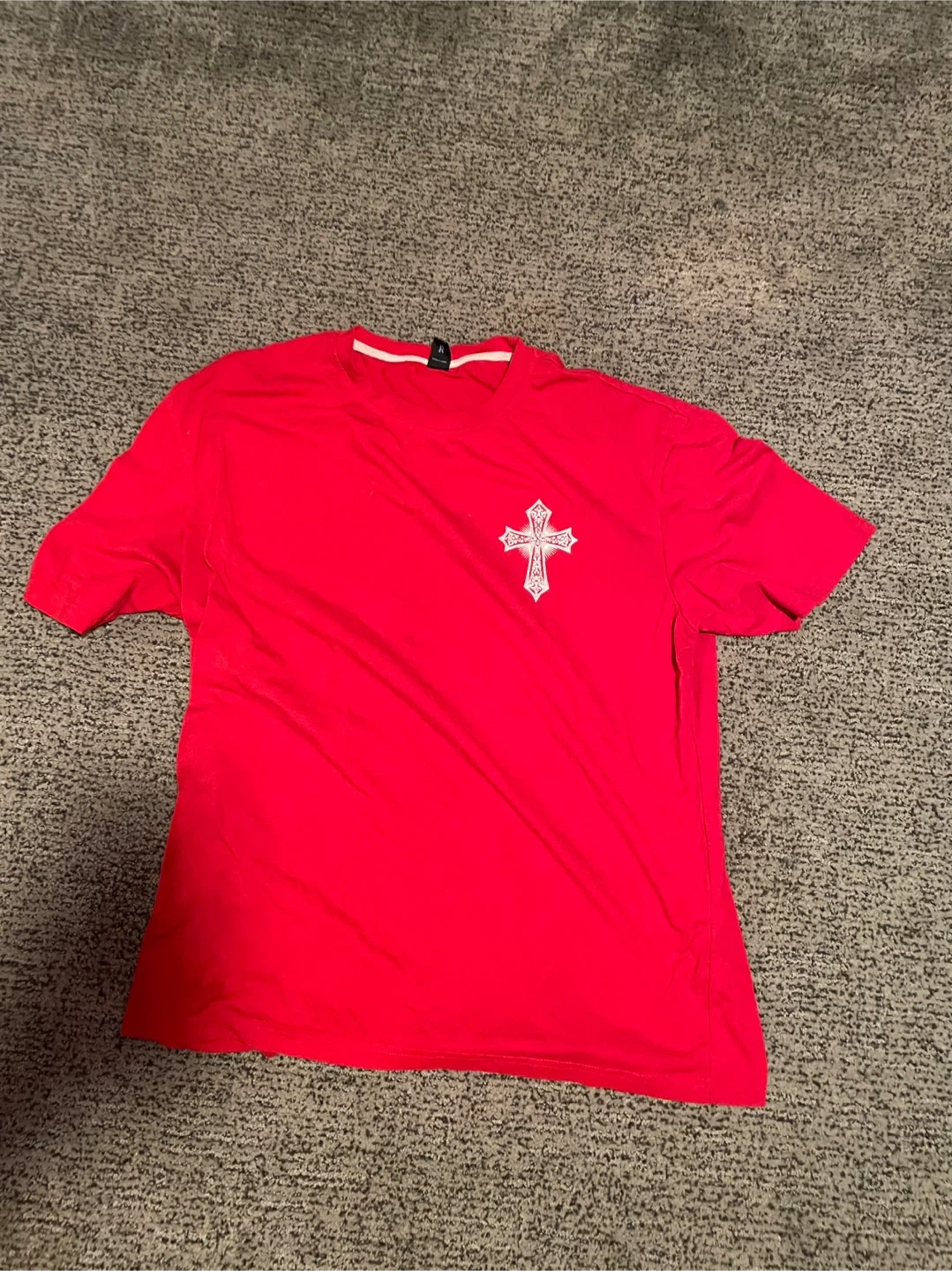This red t-shirt features a detailed graphic of a cross on the front. The back displays a larger, ornate cross design with outstretched wings. It's made of a comfortable, breathable fabric.