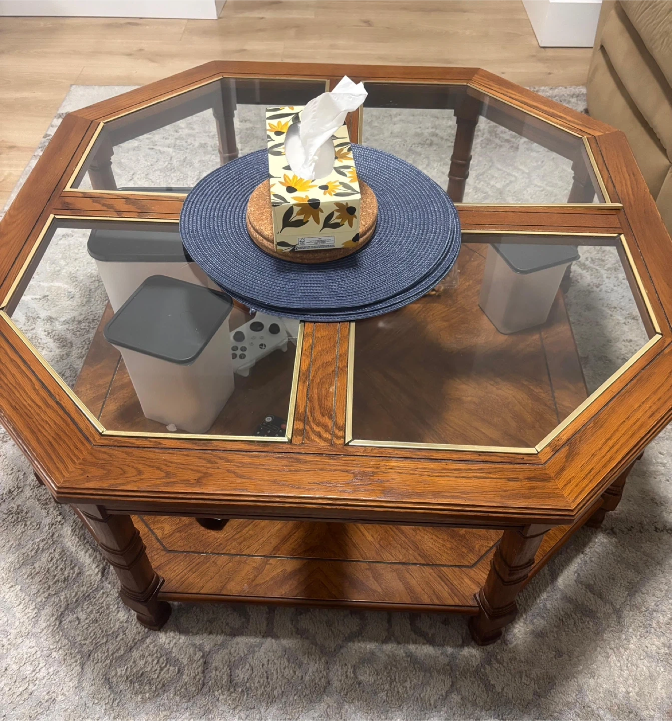 This octagonal coffee table features a durable wooden frame and a glass top. It has a lower shelf for extra storage. It's perfect for a living room or family room.