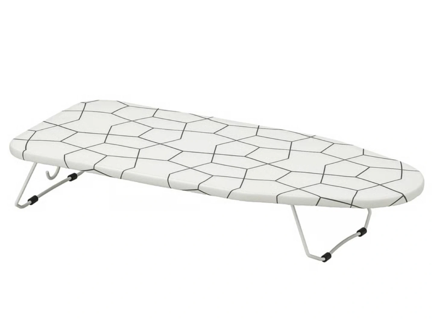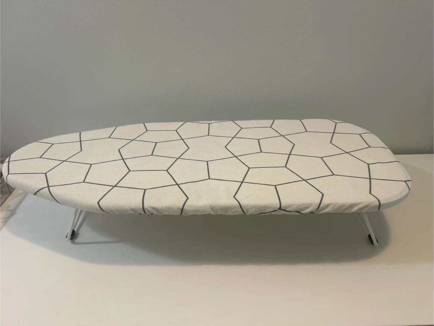 This compact tabletop ironing board is perfect for quick touch-ups and small spaces. It's designed with a sturdy metal frame and a removable, washable cover featuring a modern geometric pattern. Folds flat for easy storage!