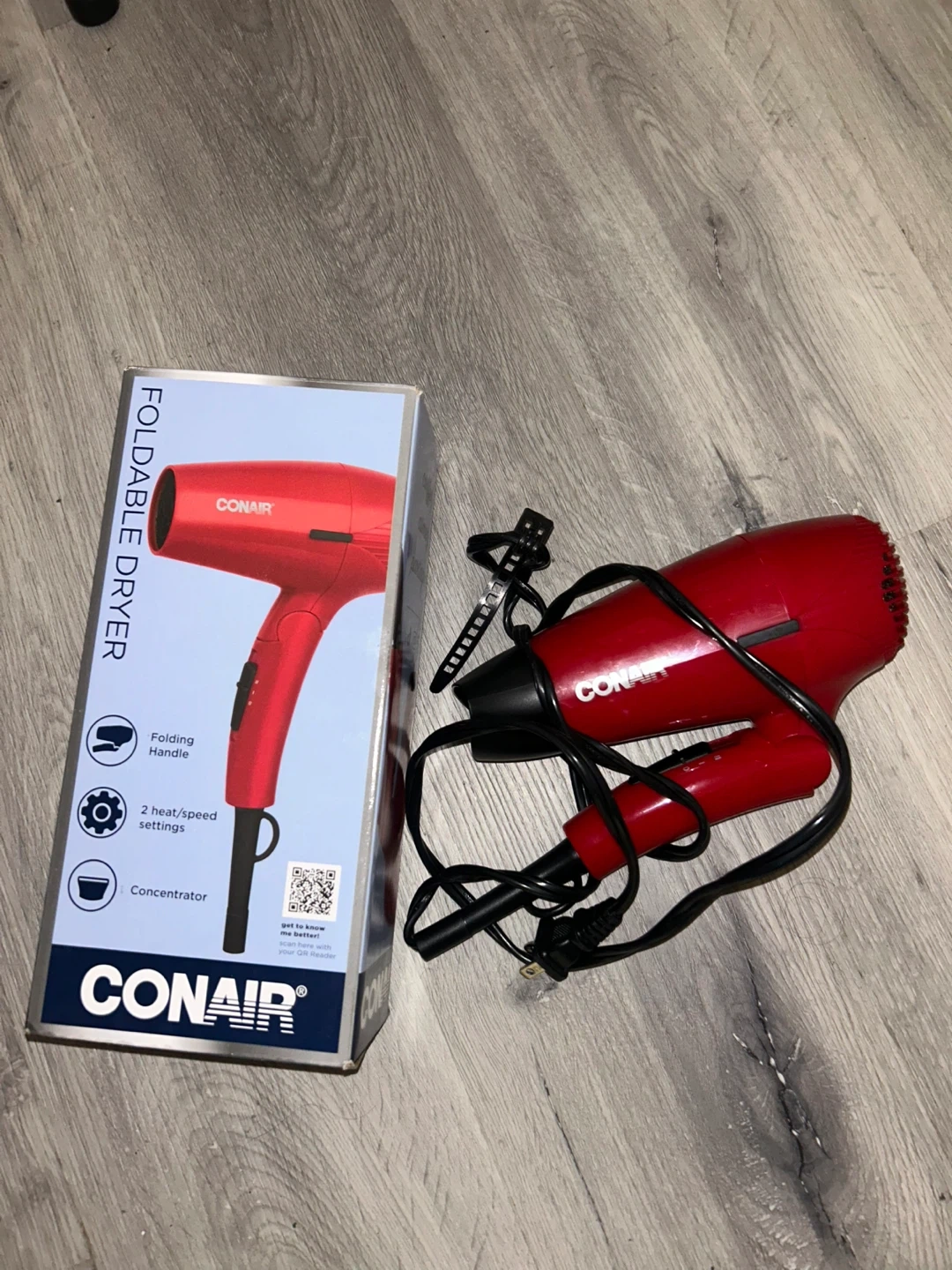 This is a red Conair foldable hair dryer. It has 2 heat/speed settings and a concentrator. The handle folds for compact storage.