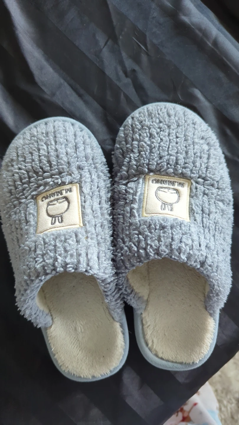 Cozy grey plush slippers. They feature a soft, fluffy exterior and a comfortable lining. Perfect for keeping your feet warm around the house! Size 42-43 (I wear womens US size 7.5)