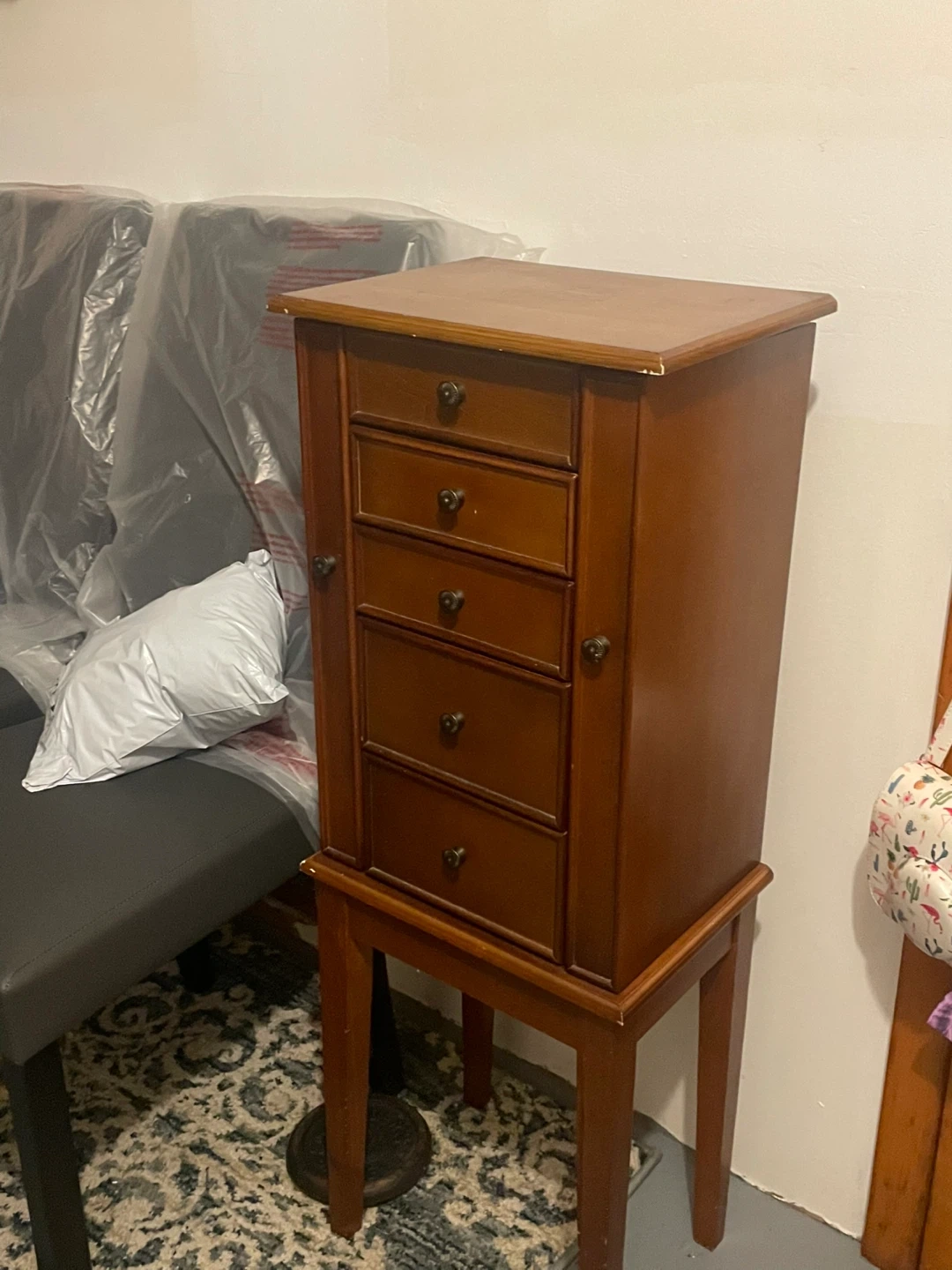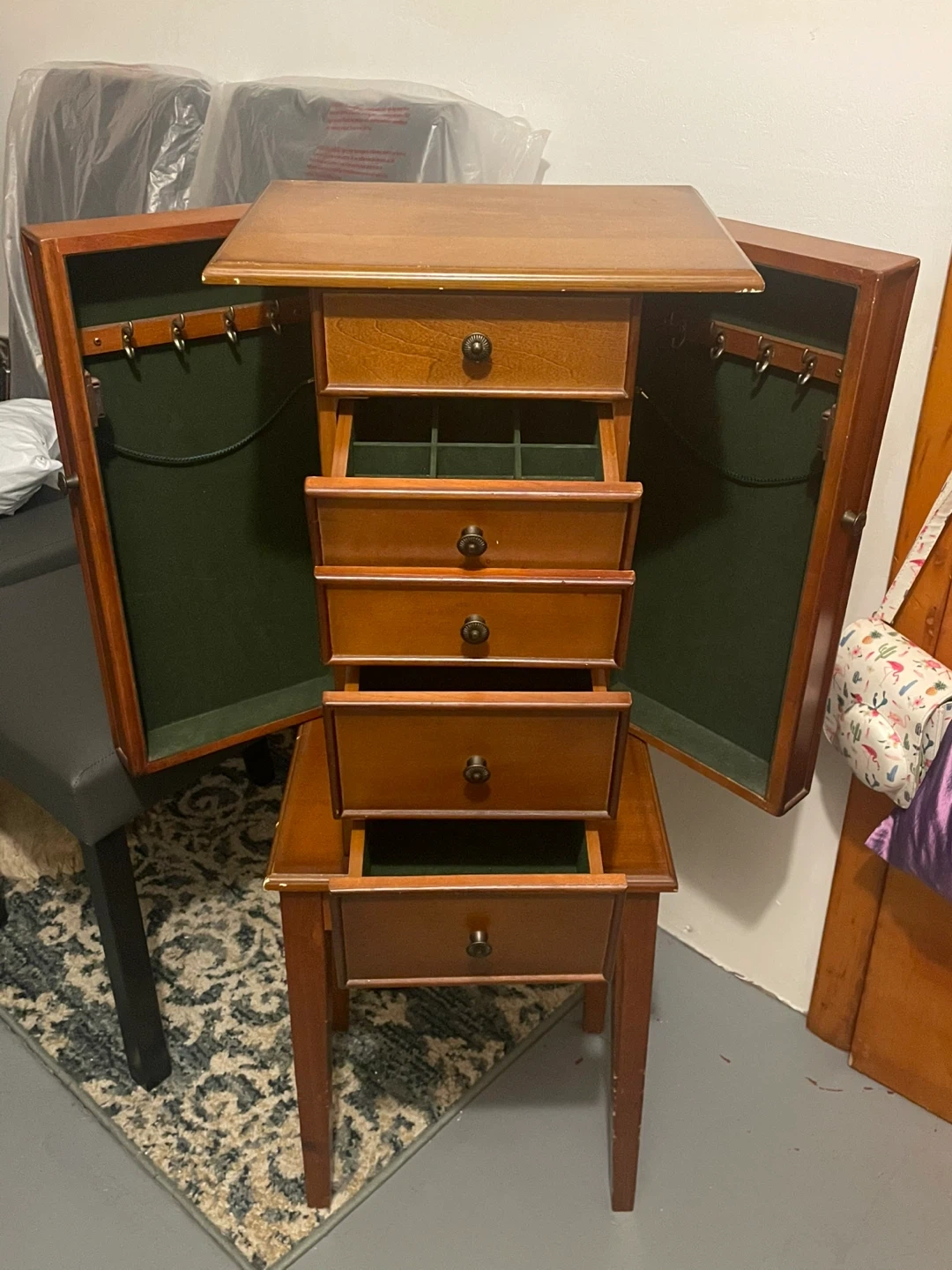Selling a jewelry armoire in good condition. It's a brown wood color and features multiple drawers for storage. The sides open up with hooks for necklaces. Perfect for keeping your jewelry organized! Please come pick it up asap I have no space again my husband can deliver but that will be a fee !