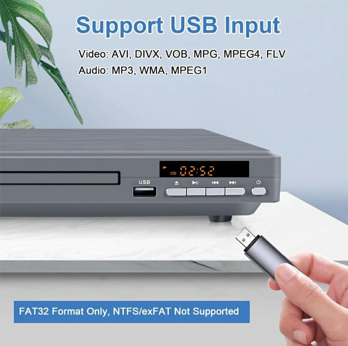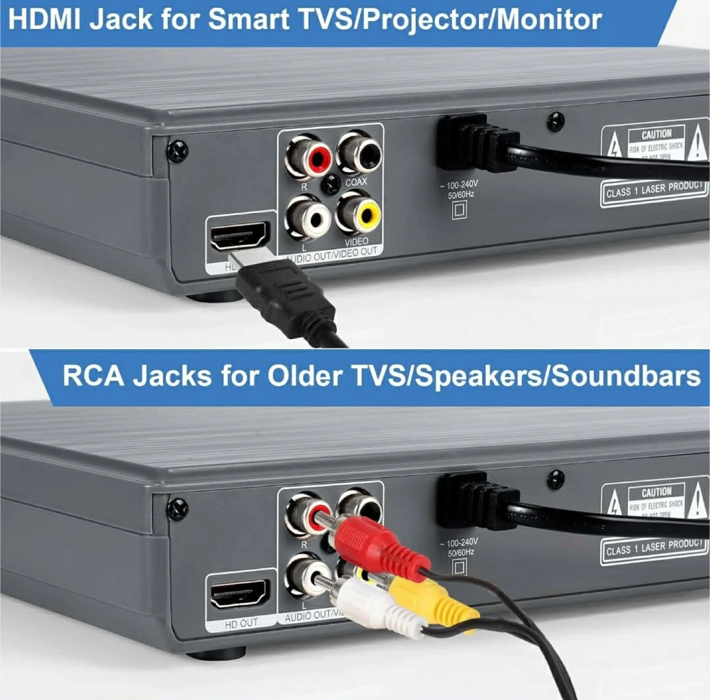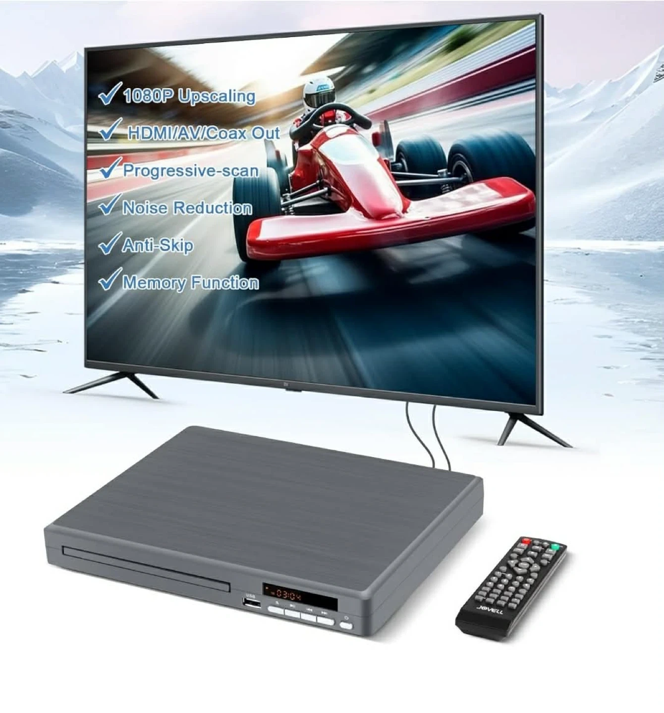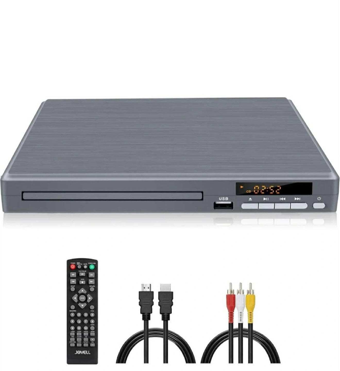 This JOVELL DVD player offers 1080P upscaling and progressive scan. It supports HDMI and RCA connections for smart TVs and older models. The player also has USB input for video and audio playback.