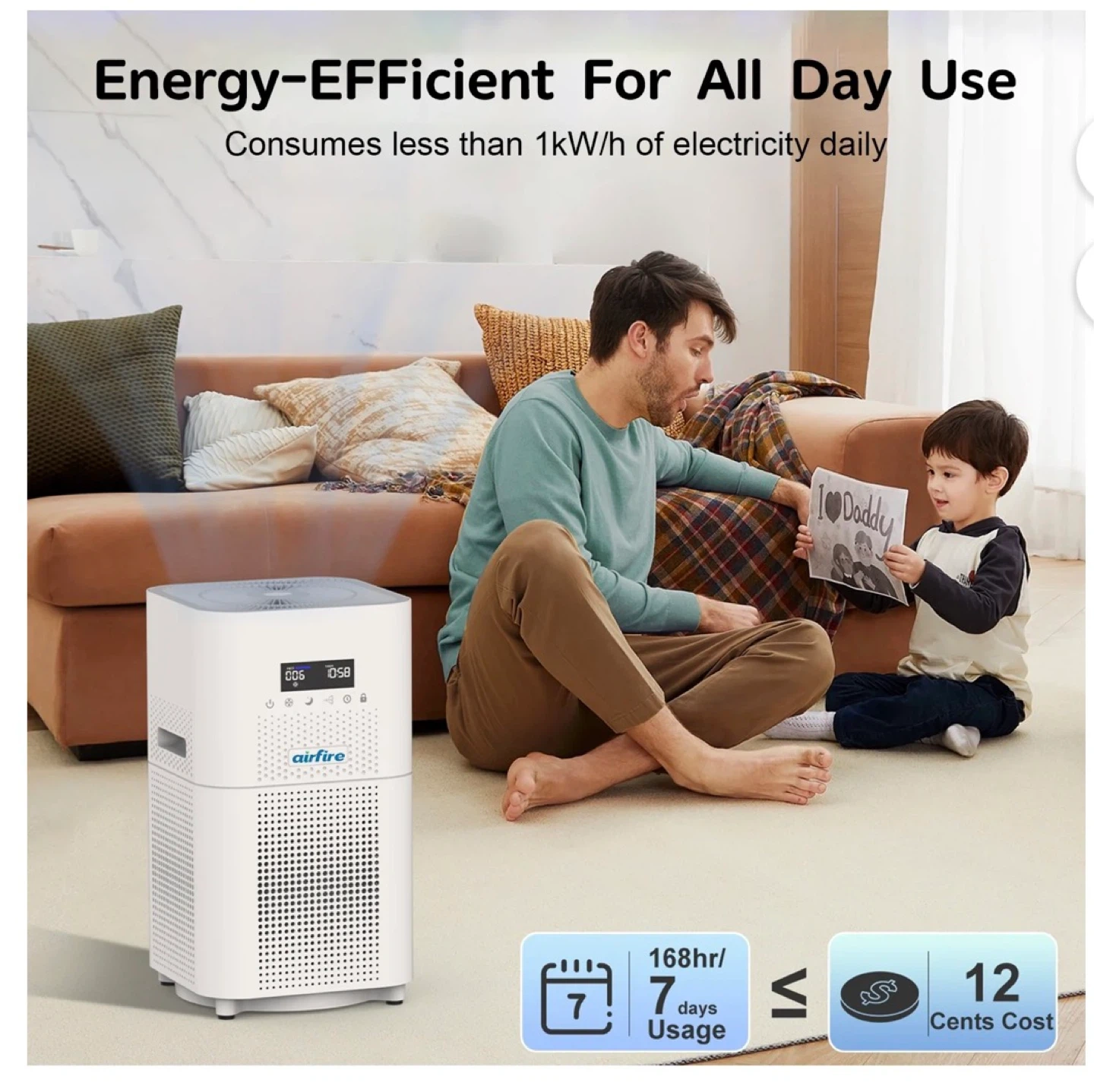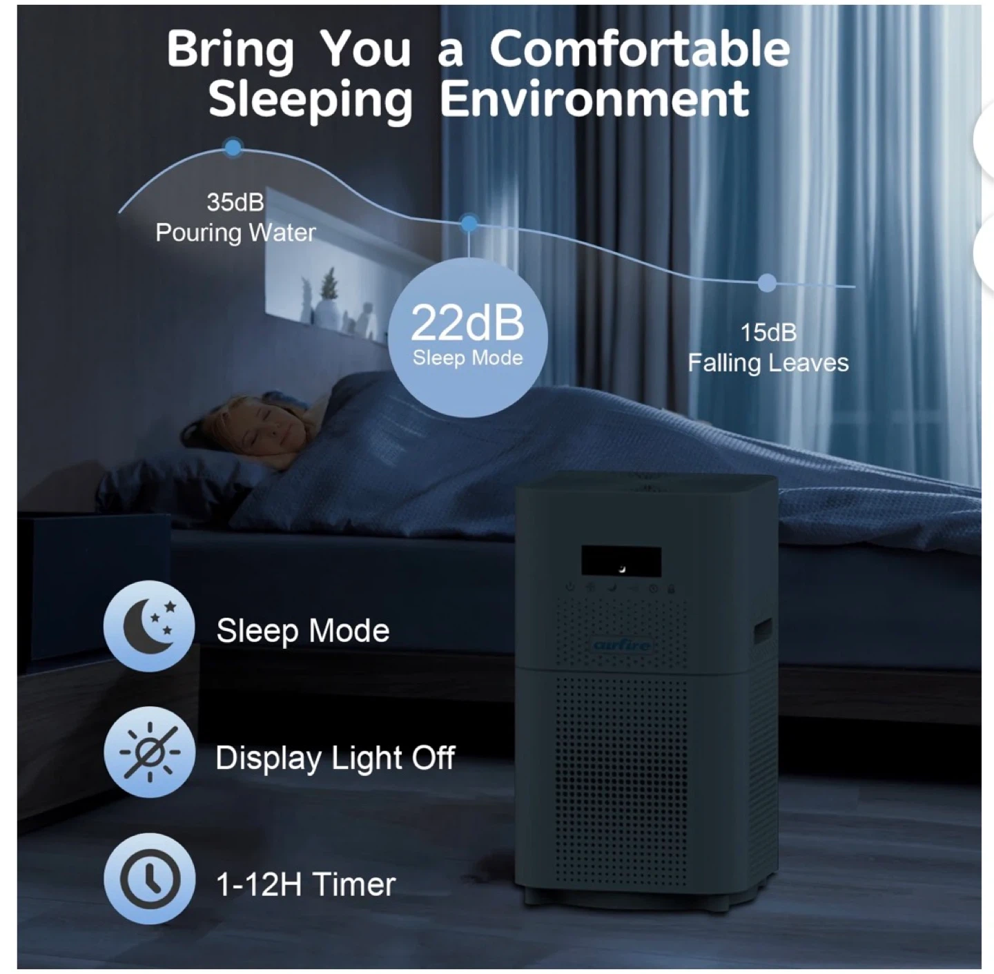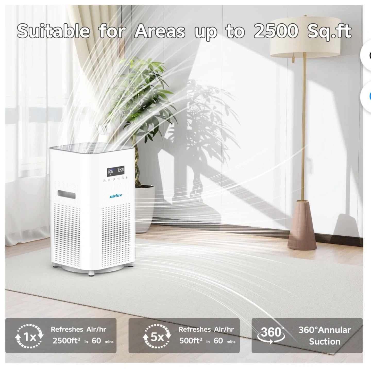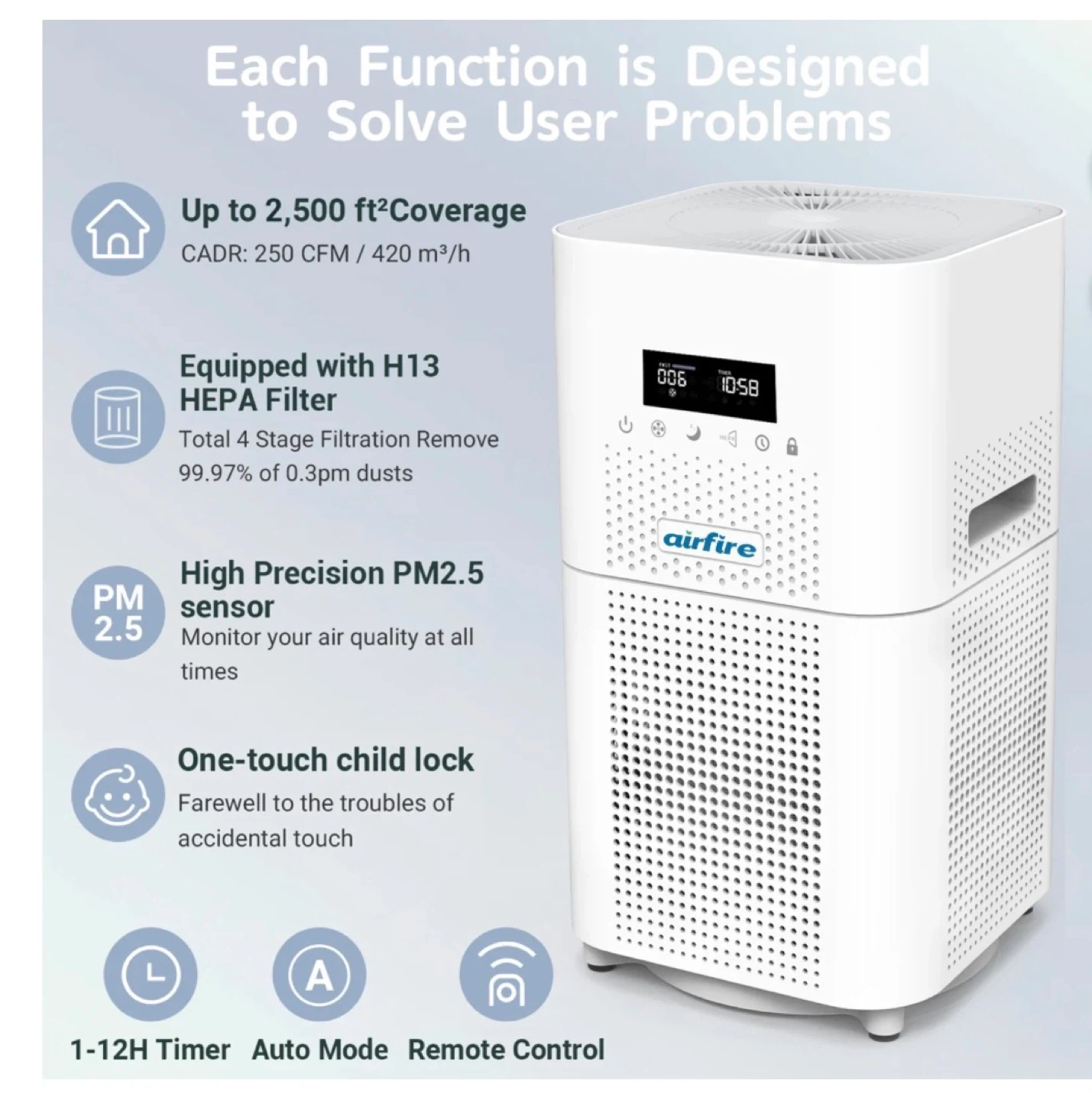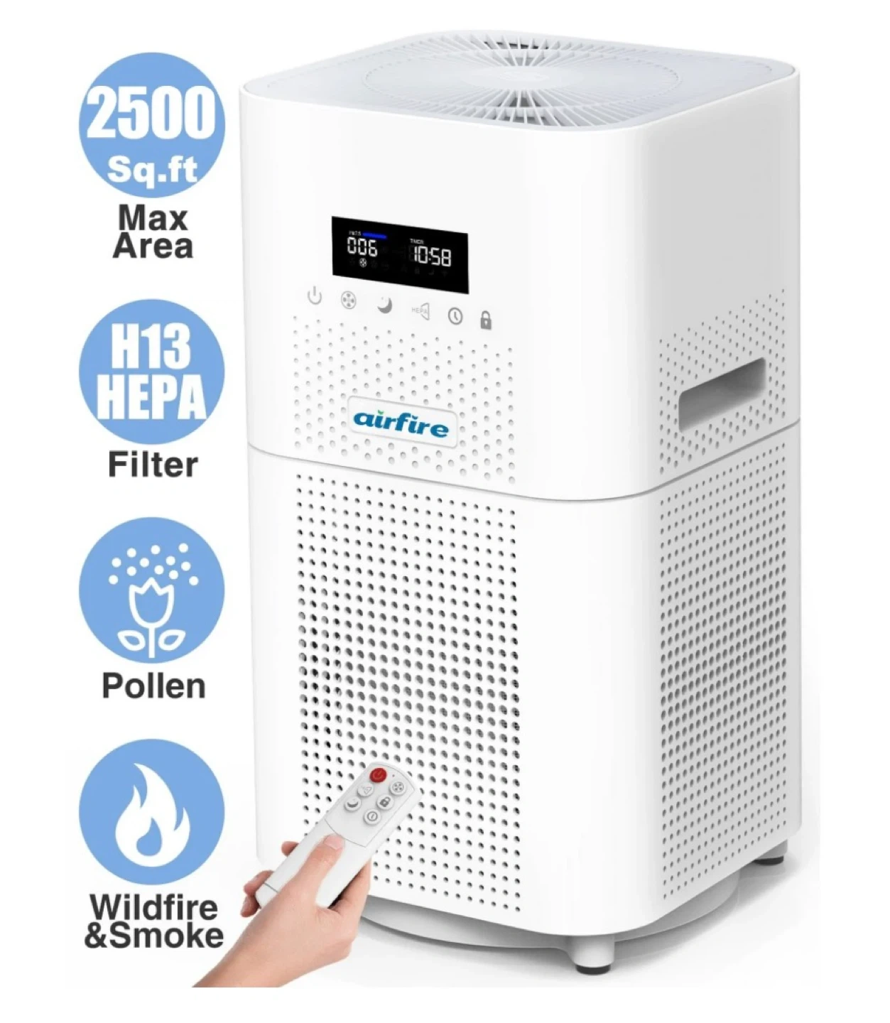 This air purifier covers up to 2,500 sq ft. It's equipped with an H13 HEPA filter and a high-precision PM2.5 sensor. Features include a one-touch child lock, 1-12H timer, auto mode, and remote control.