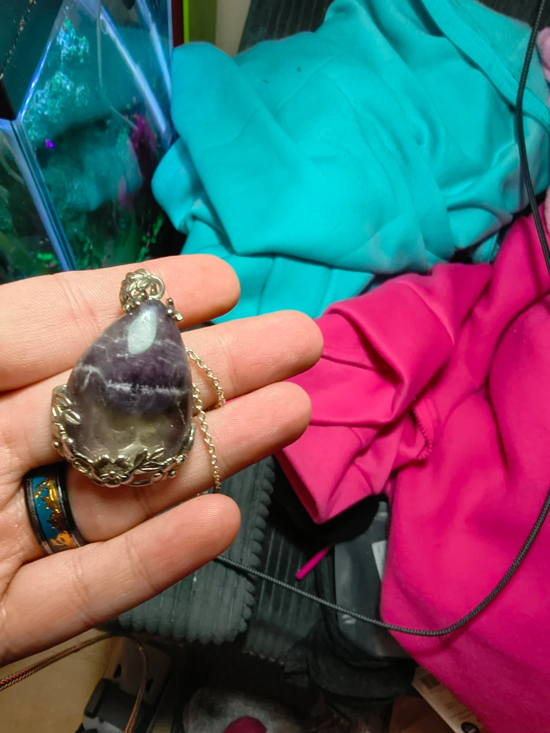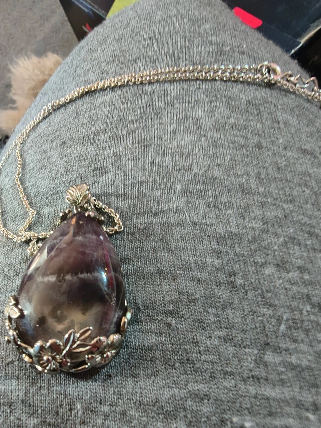 Large, tear-drop shaped dark amethyst pendant with a silver-tone wire-wrapped setting and a fine silver-tone chain. The chain is adjustable with a lobster clasp closure.