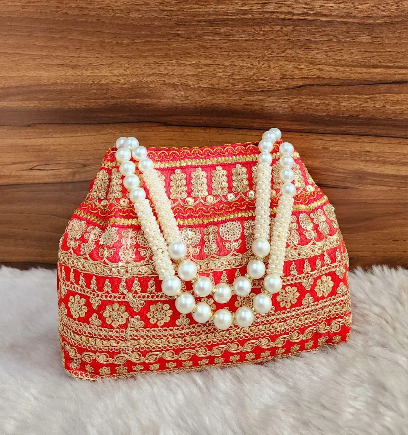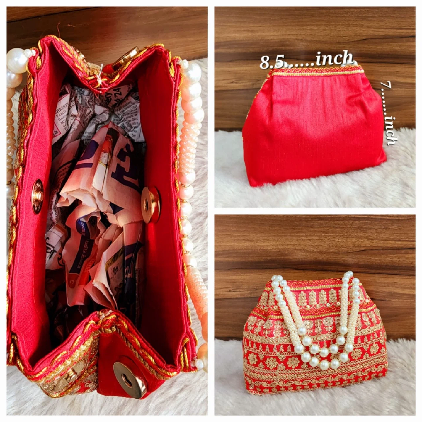 This festive clutch bag is adorned with intricate embroidery and pearl handles. It measures approximately 8.5 inches wide and 7 inches tall. The interior lining is red satin.