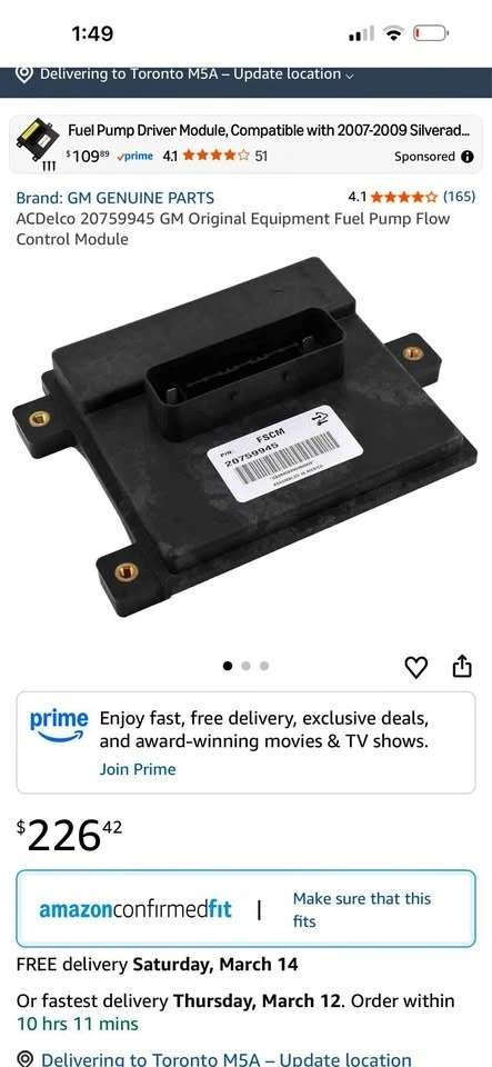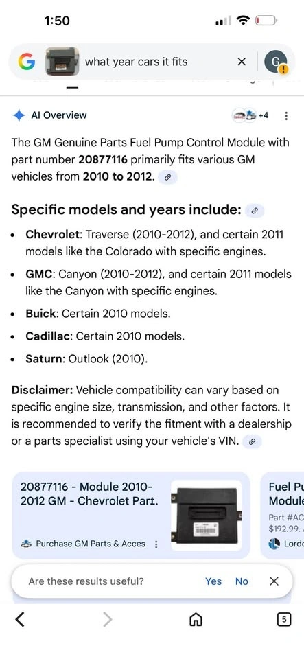 Used like new GM Genuine Parts Fuel Pump Control Module with part number 20877116. Primarily fits various GM vehicles from 2010 to 2012. Specific models include Chevrolet Traverse (2010-2012), GMC Canyon (2010-2012), certain 2011 Colorado and Canyon models with specific engines, some 2010 Buick and Cadillac models, and Saturn Outlook (2010). Feel free to message if you have any questions!