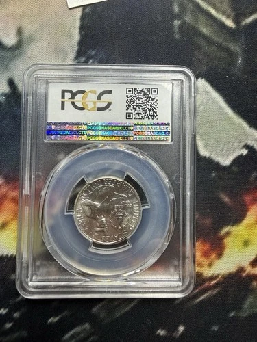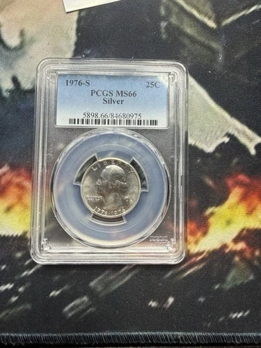 A commemorative silver quarter dollar celebrating the bicentennial of the United States. Graded MS 66 by Professional Coin Grading Service (PCGS), this coin boasts exceptional quality and preservation with a lustrous sheen and intricate detailing. This piece is a must-have for collectors with a passion for American heritage and commemorative coins.