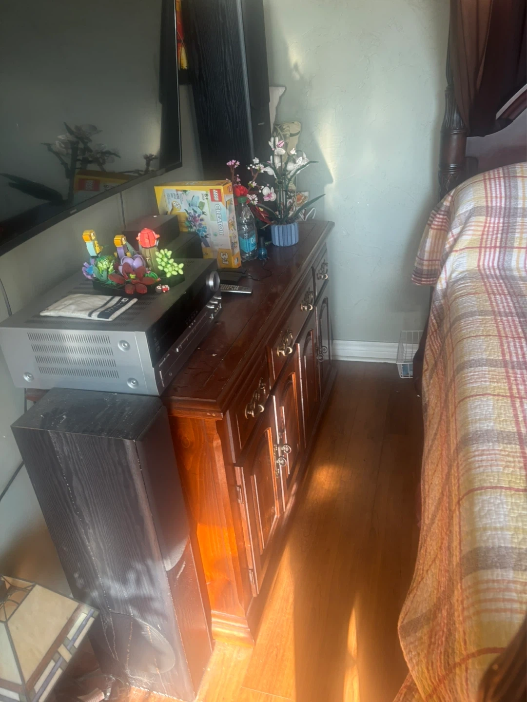 Beautiful wooden sideboard with ornate brass hardware. It features three drawers and four cabinet doors for ample storage. The rich wood finish adds warmth to any room.