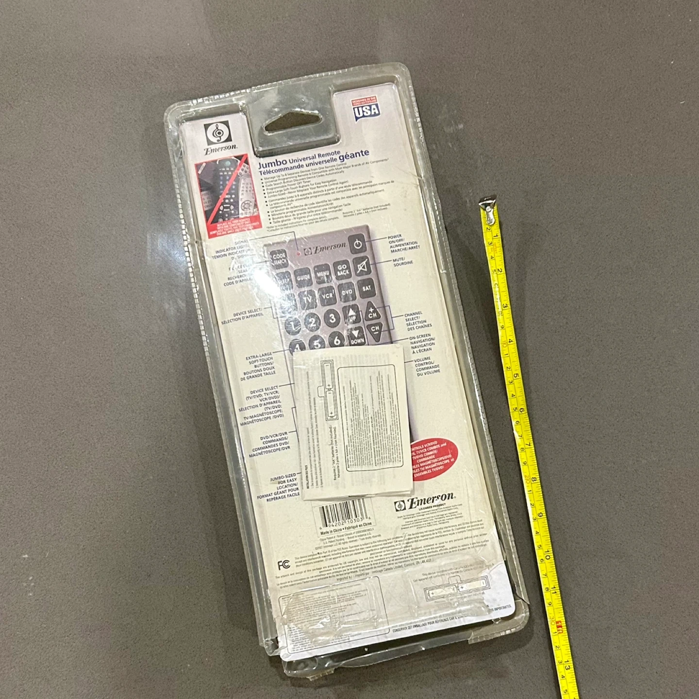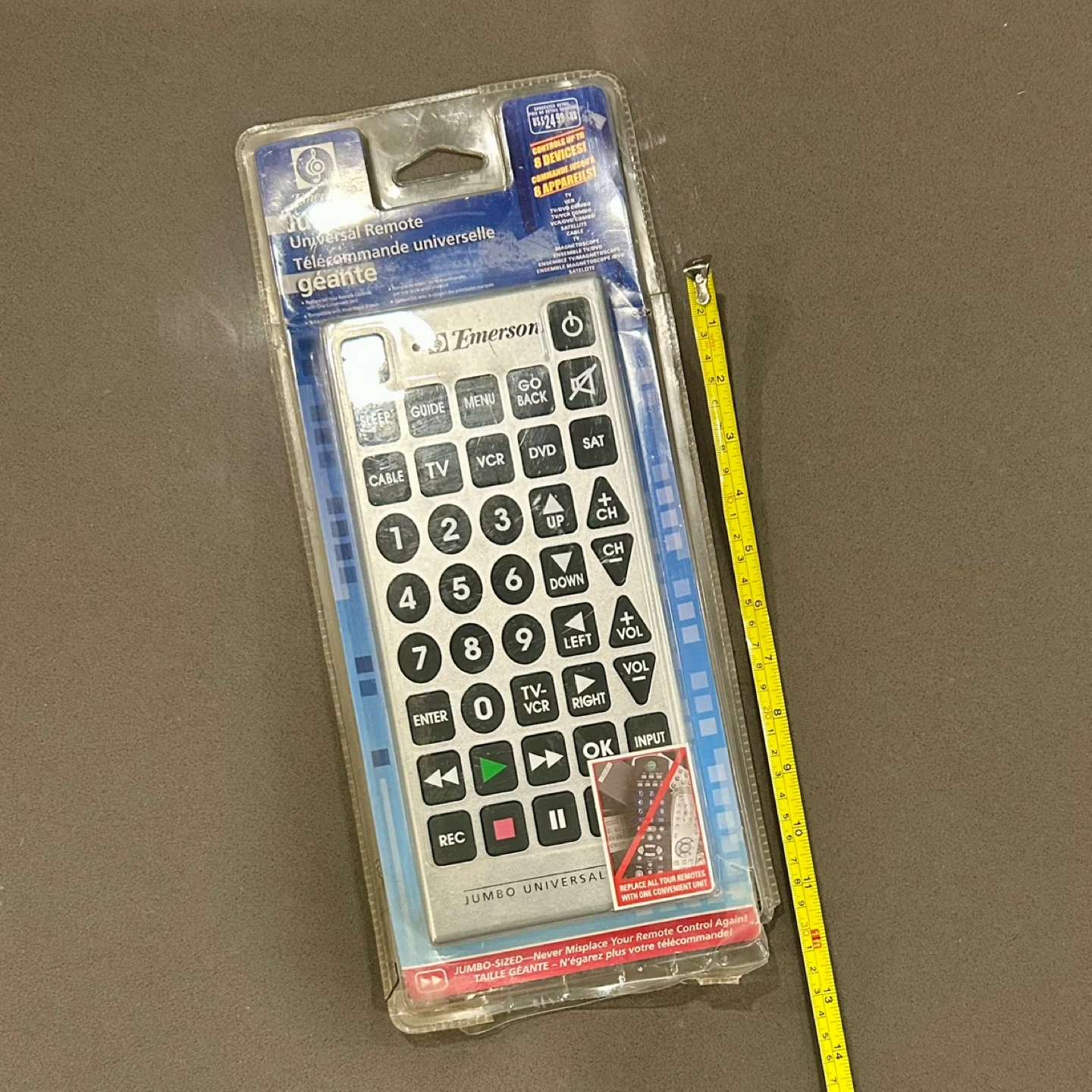 I have a brand new Emerson Jumbo Universal Remote for sale! It's still in its original packaging. This remote can manage up to 8 devices and has extra-large, soft-touch buttons. It's programmable and features a code search button, making it easy to set up. A great way to replace all your remotes with one convenient unit!