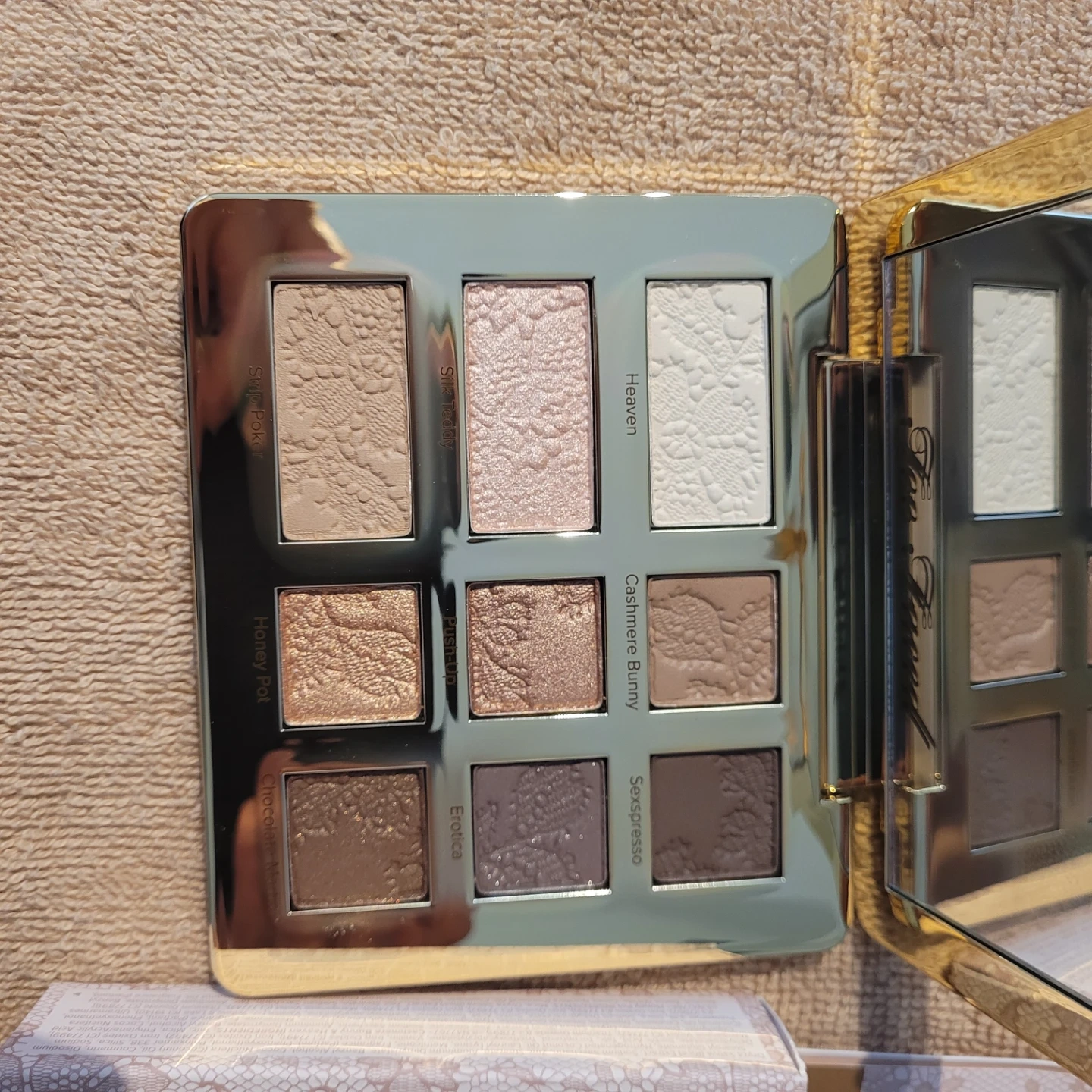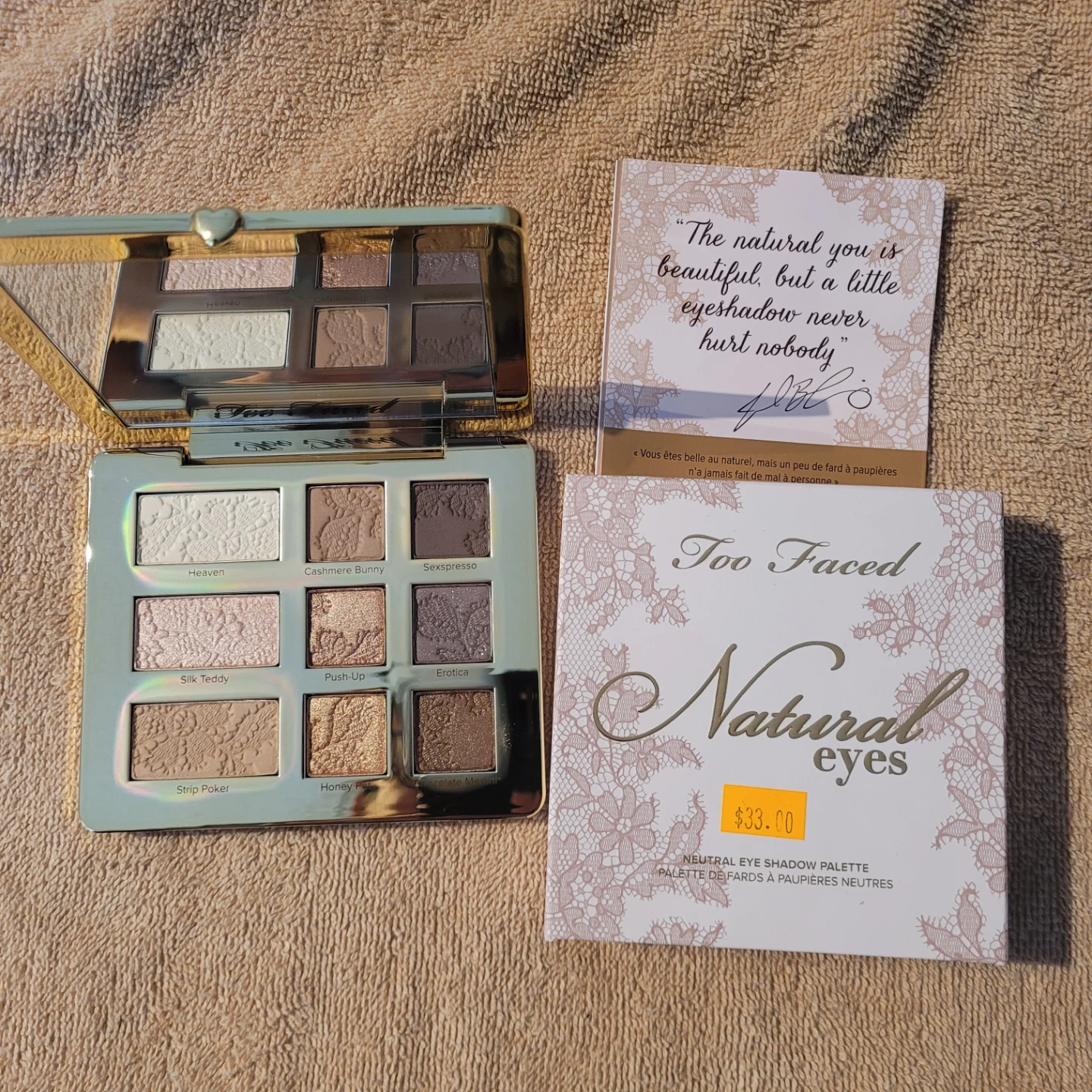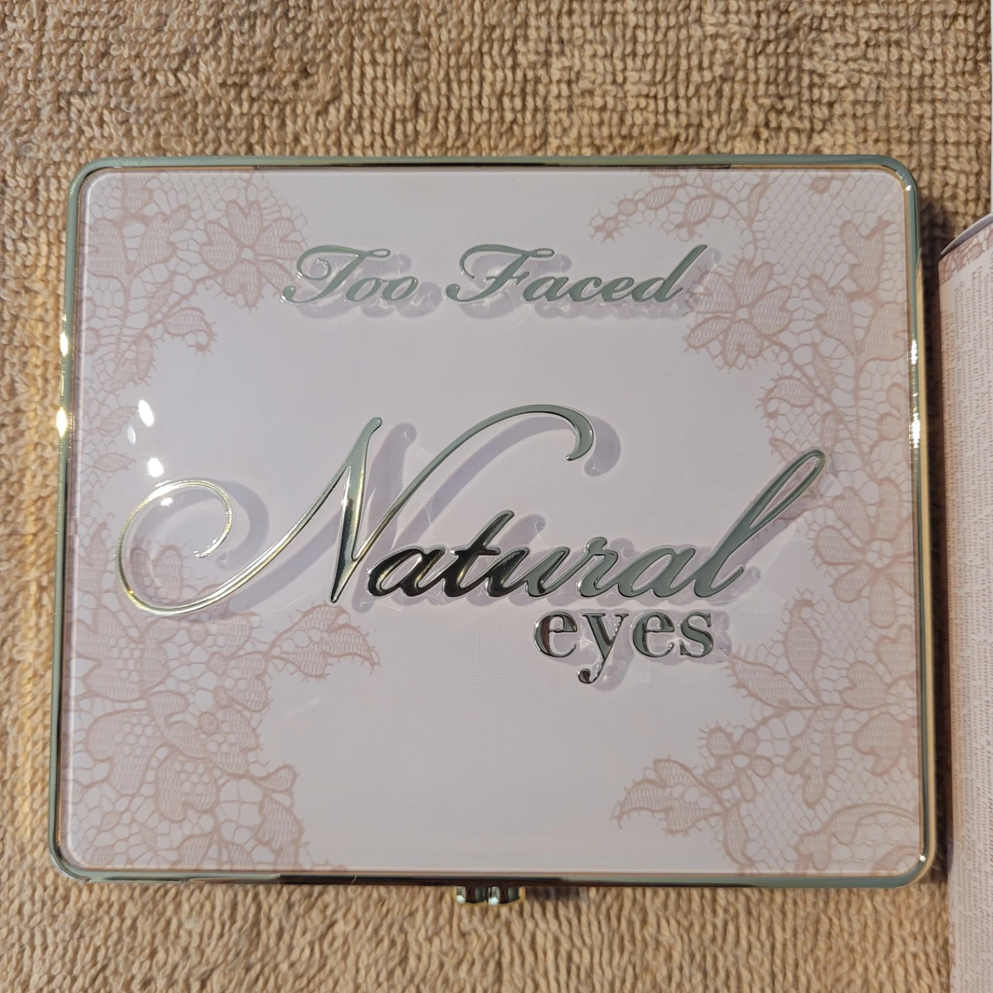 This Too Faced Natural Eyes palette features nine neutral shades. It includes a mirror and a dual-ended brush. The palette is designed for creating natural looks.