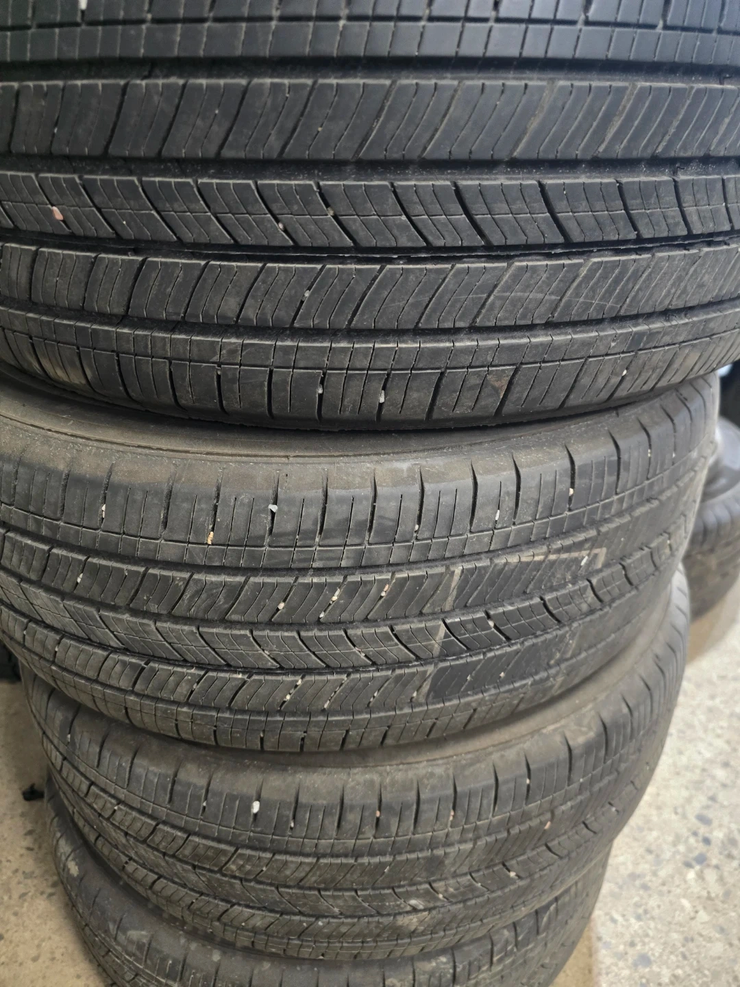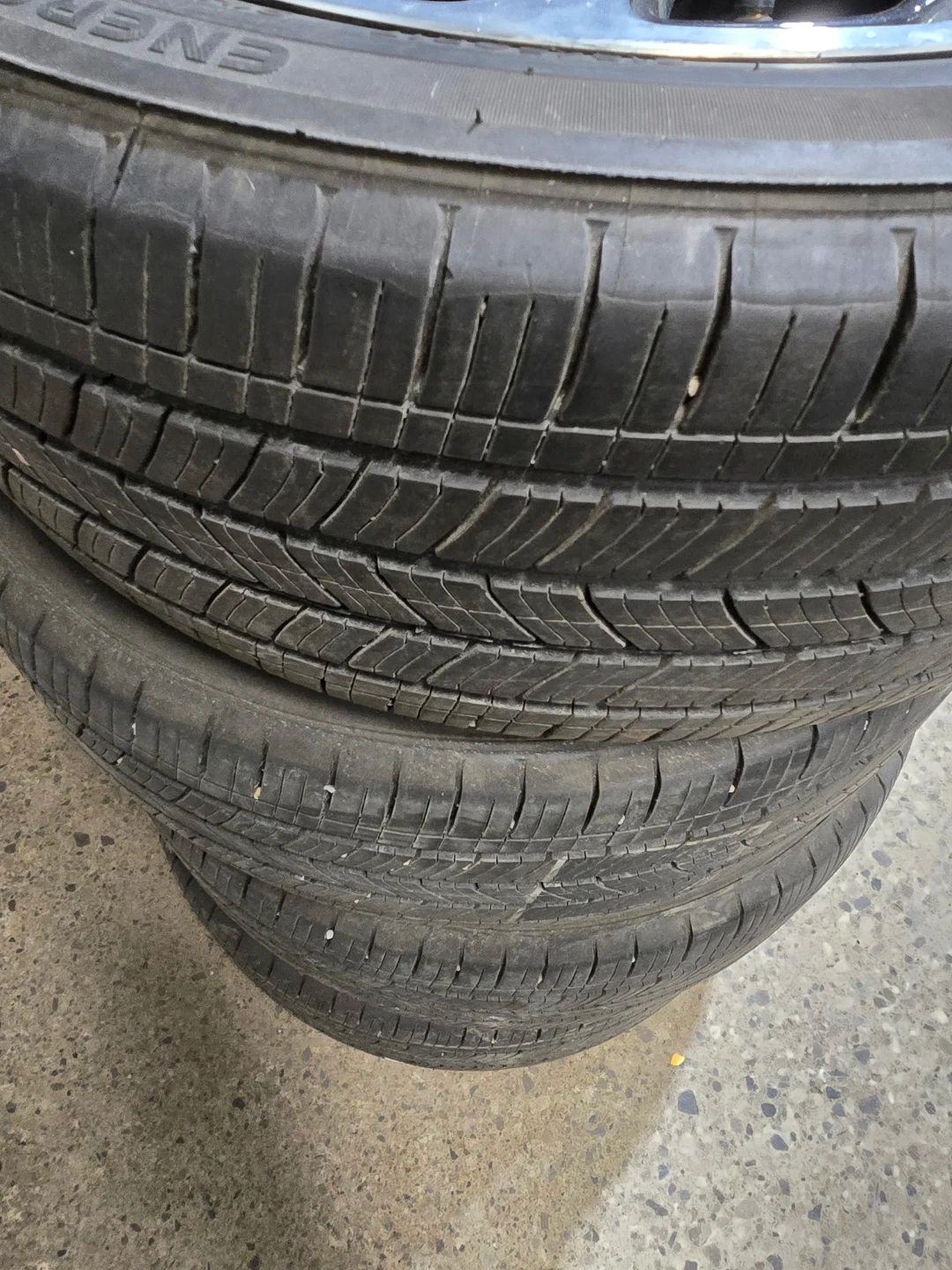 Set of four tires mounted on alloy rims. Size P215/55R17. These tires and rims are in good used condition. They're ready for a new vehicle!