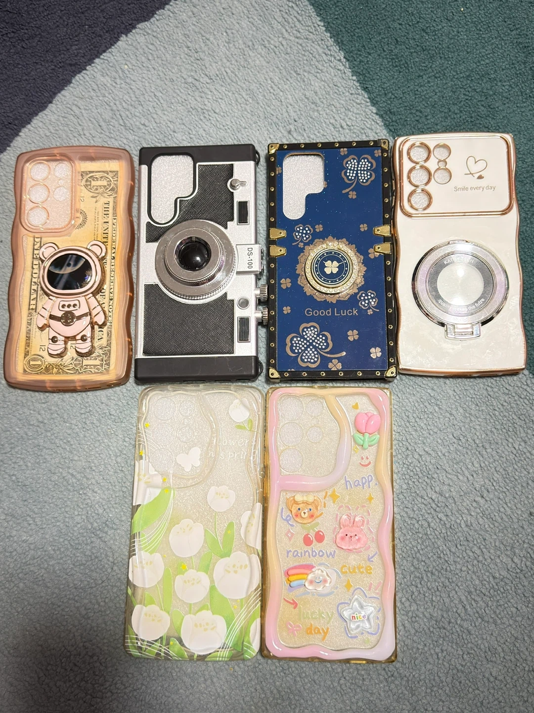 A collection of six unique decorative phone cases. Designs include a dollar bill with an astronaut, a retro camera, a blue 'Good Luck' design, a white case with 'Smile every day', a clear case with white tulips, and a colourful case with cute cartoon characters. They're made from various materials for different phone models.