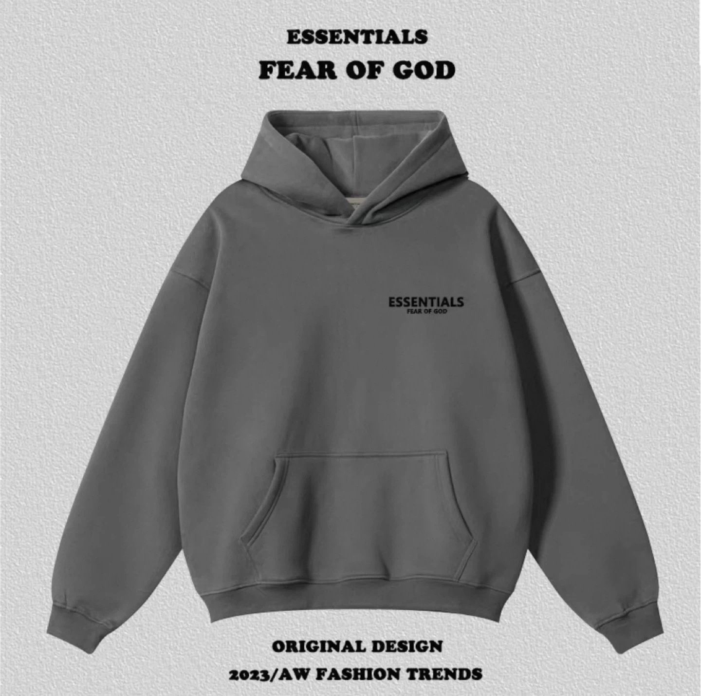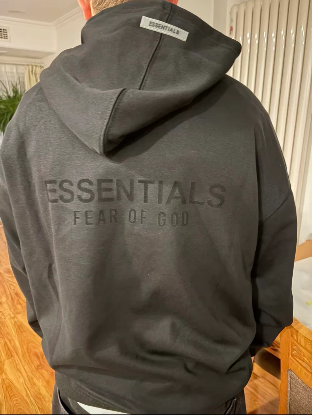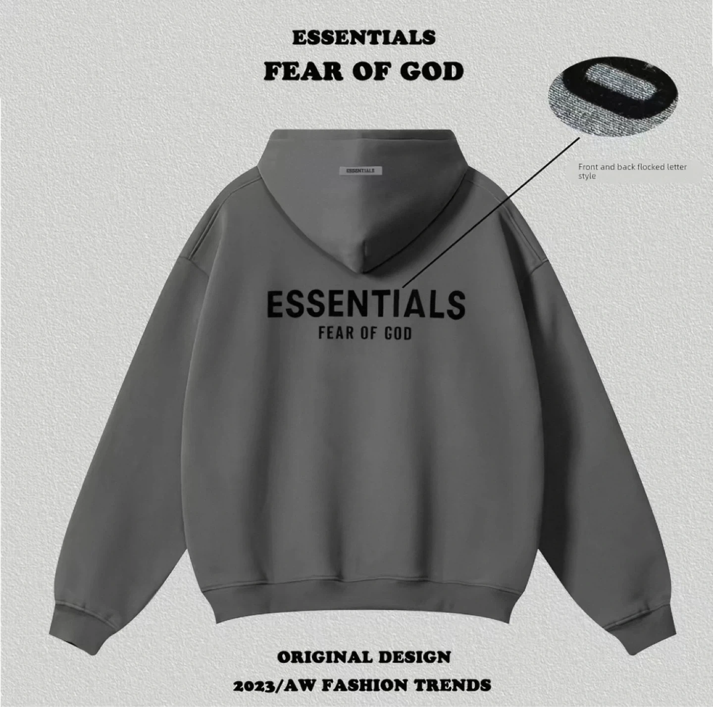 This is a Fear of God Essentials hoodie. It features flocked lettering on the back and front. Made from comfortable material, it's great for everyday wear.