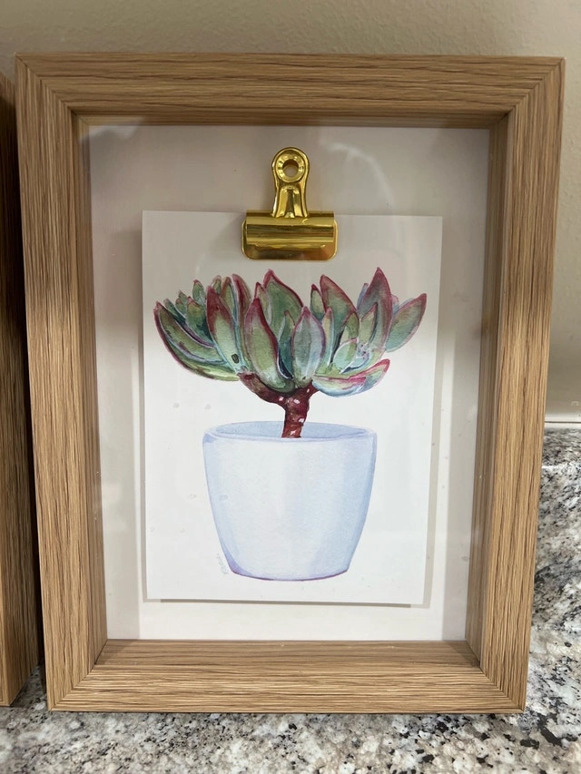 Add a touch of greenery to your walls with this pair of framed succulent prints! These charming pieces each feature a unique succulent illustration, bringing a bit of the outdoors inside. The light wood frames and golden clips add a modern, stylish touch. They have been previously displayed and are in good condition. Ready to give your space a little refresh?