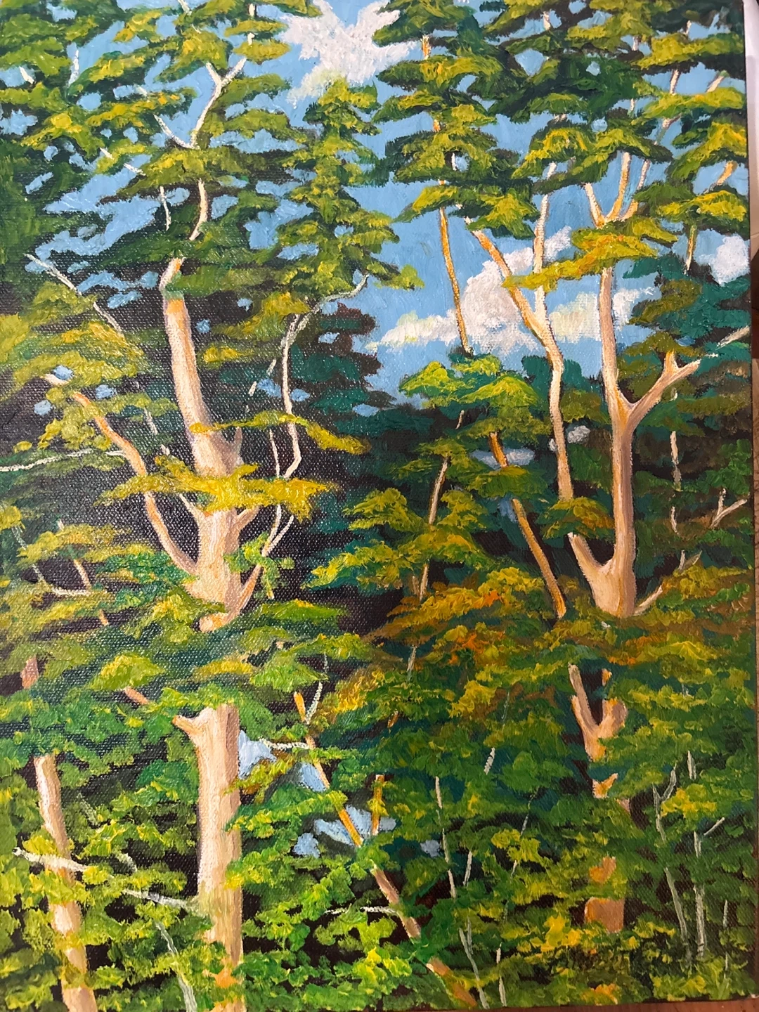 A beautiful painting depicting a dense forest with sunlight filtering through the trees. Features a mix of green foliage and light-coloured tree trunks against a blue sky with clouds. This artwork would add a natural touch to any room's decor.