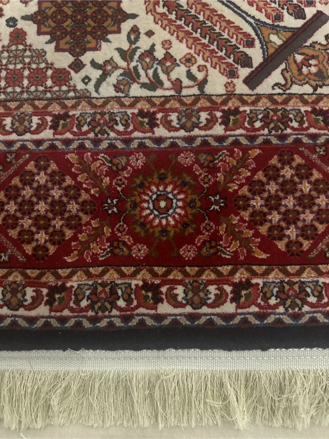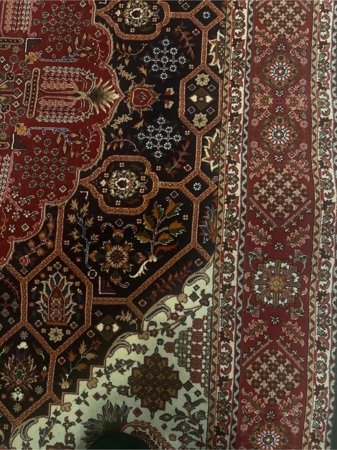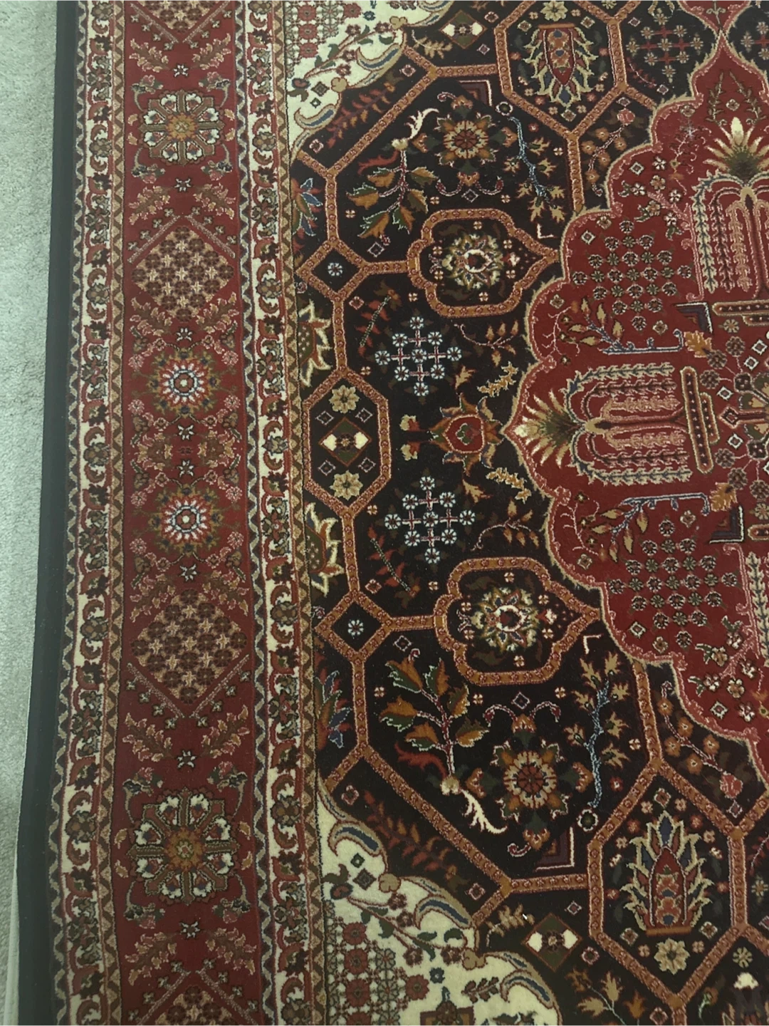 This is a beautiful luxury area rug with a traditional Persian design. It features intricate patterns in rich colours like deep red, navy, and cream. It's made of durable material and would add elegance to any room. 700 Reeds, 2100 Picks. Grade 1 Made in Iran.