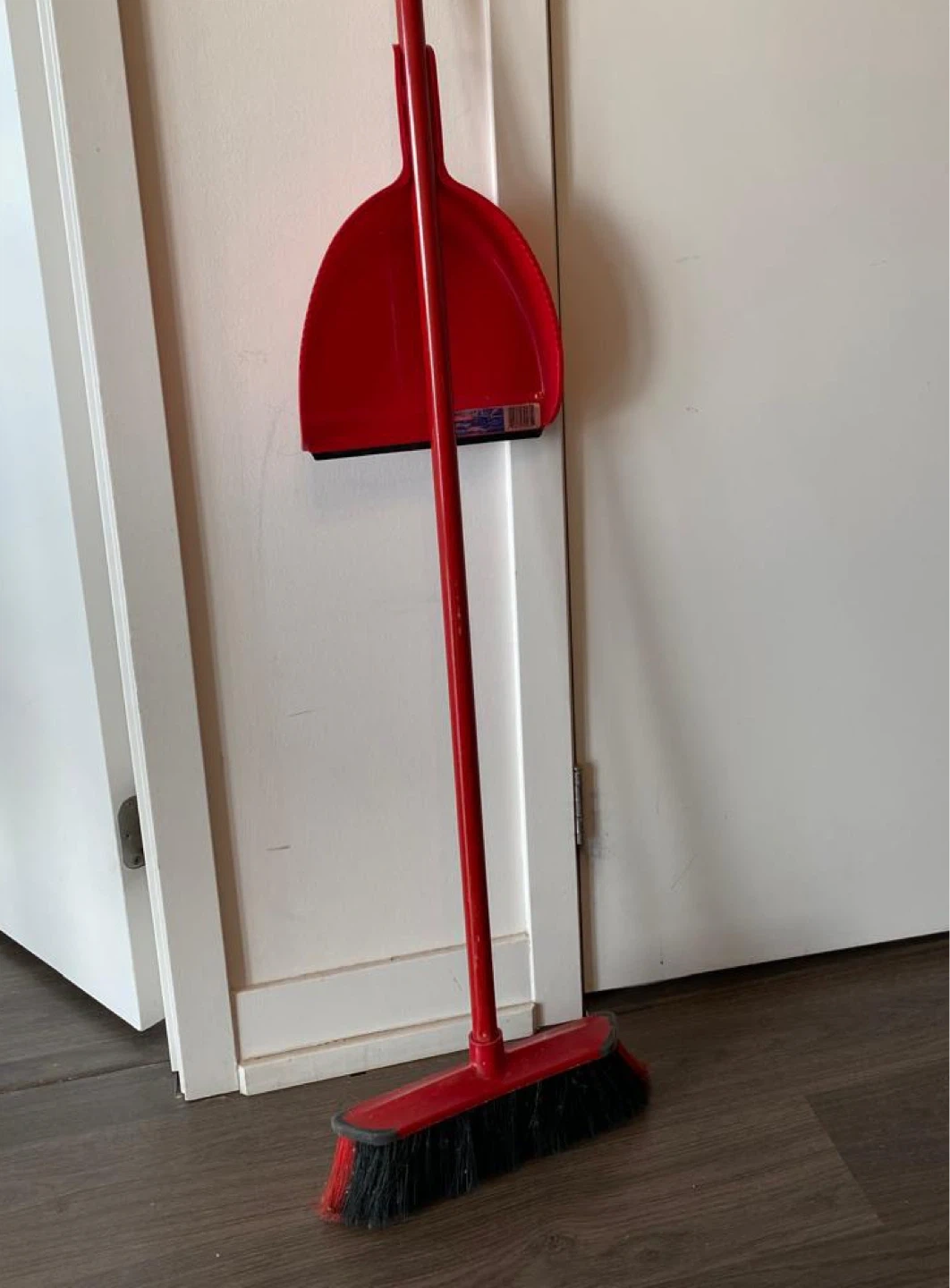 A bright red broom and dustpan combo. Perfect for quick cleanups around the house. The dustpan clips onto the broom for easy storage.