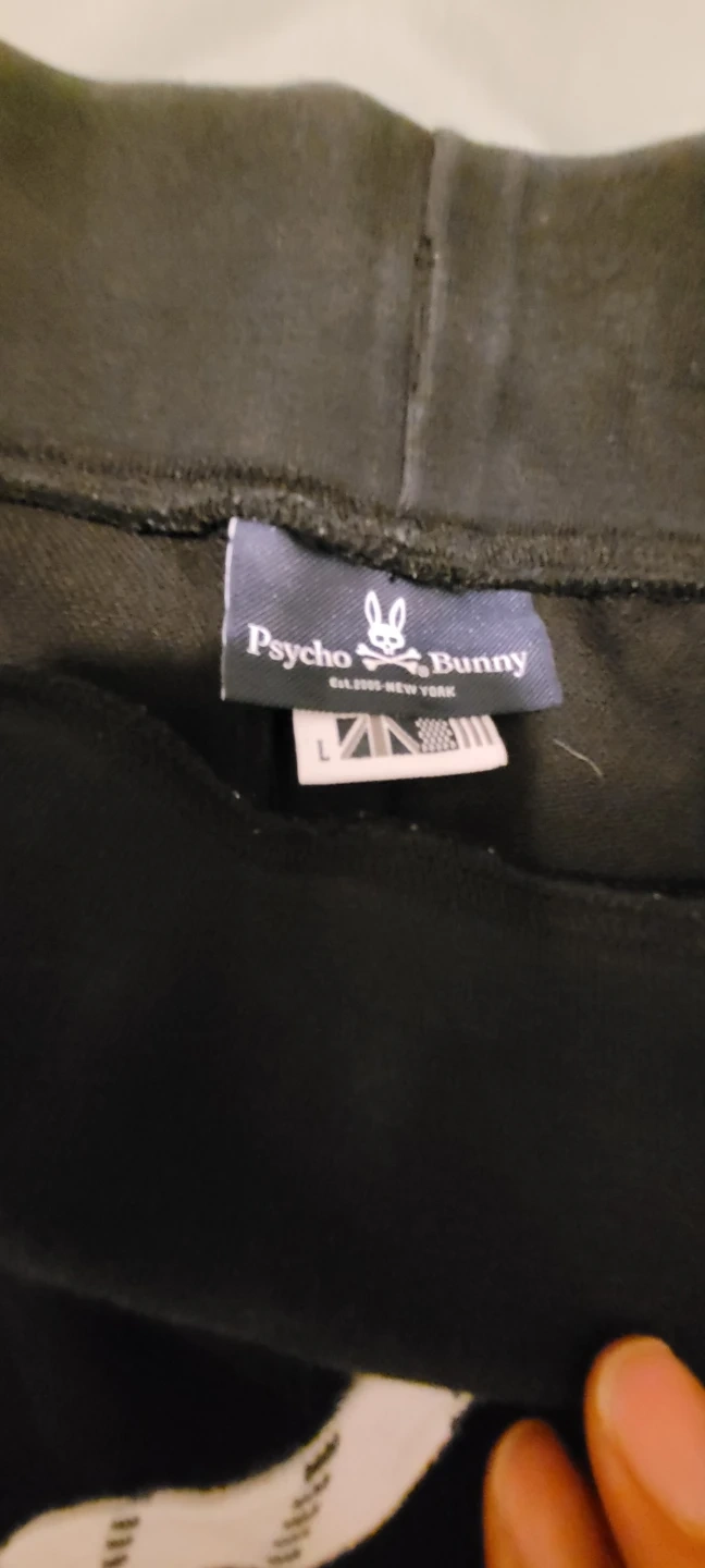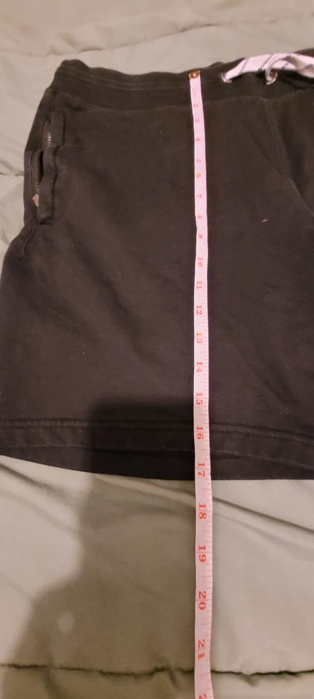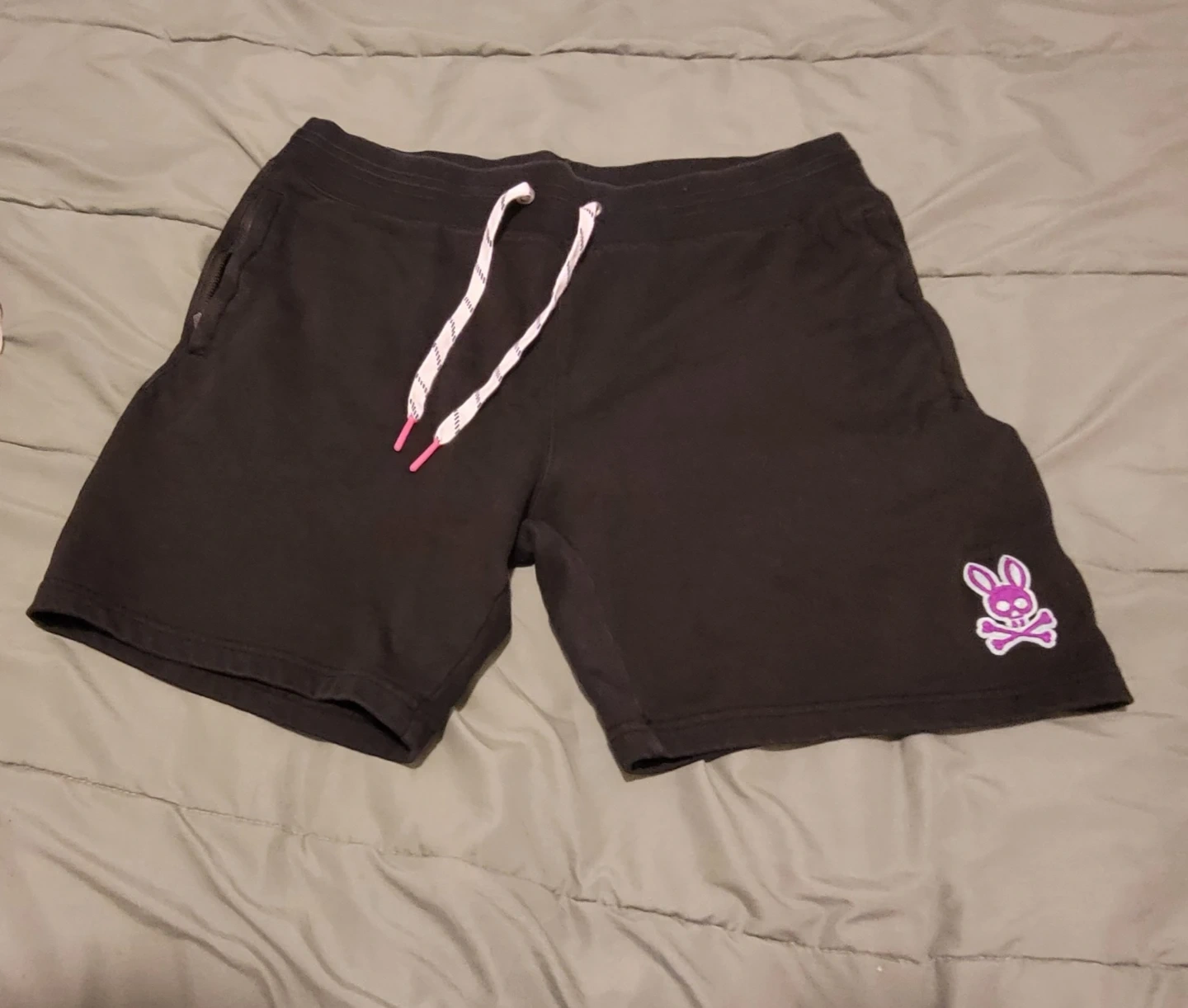 Psycho Bunny black sweat shorts with pink embroidered logo. Elastic waistband with drawstring. Two side pockets and one back pocket. Waist measures 17 inches flat, inseam measures 10 inches.
