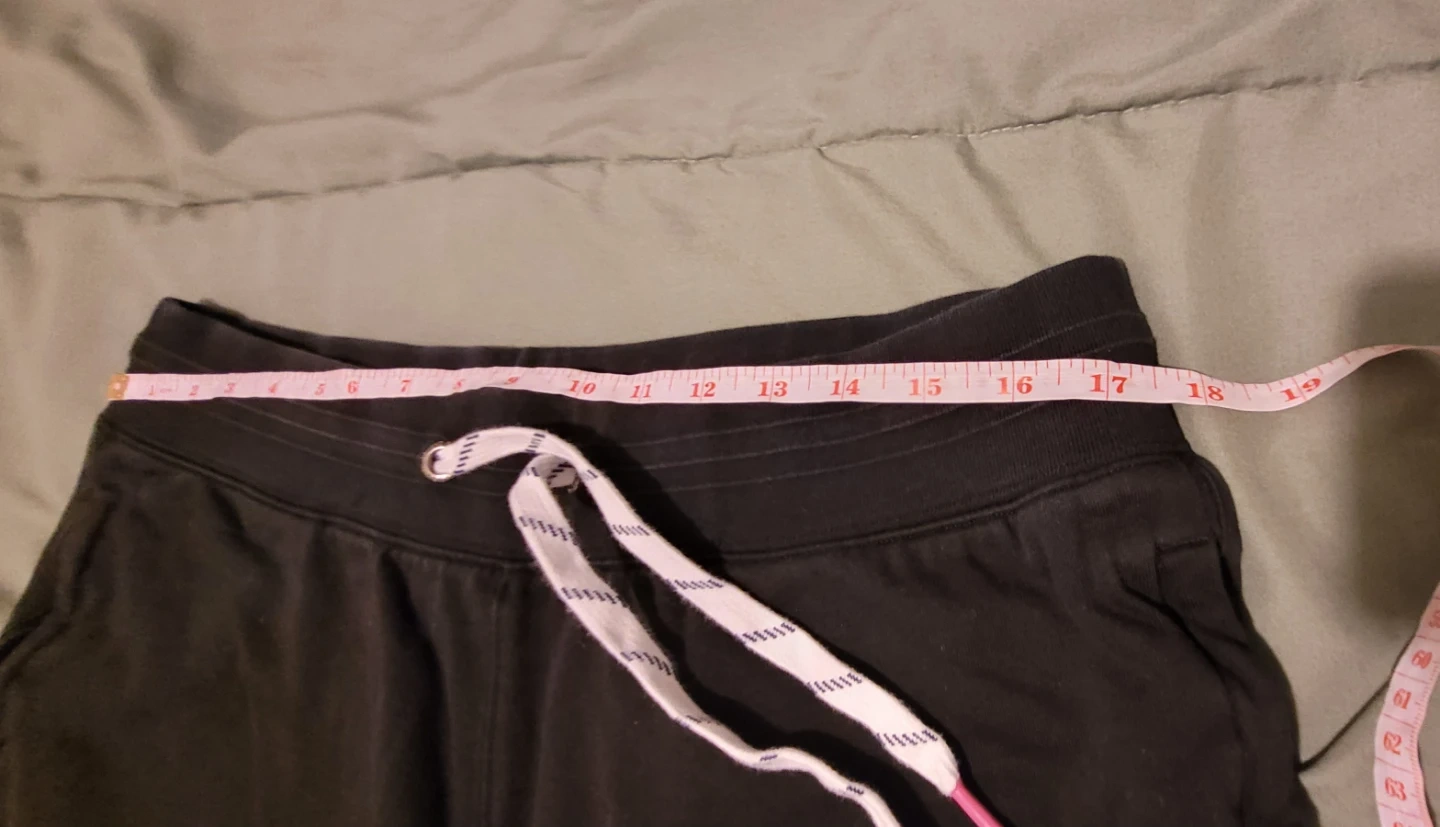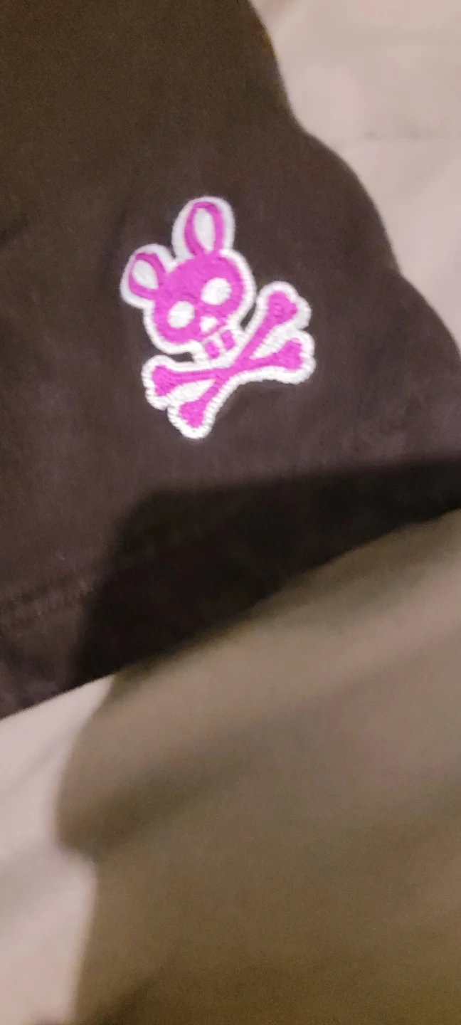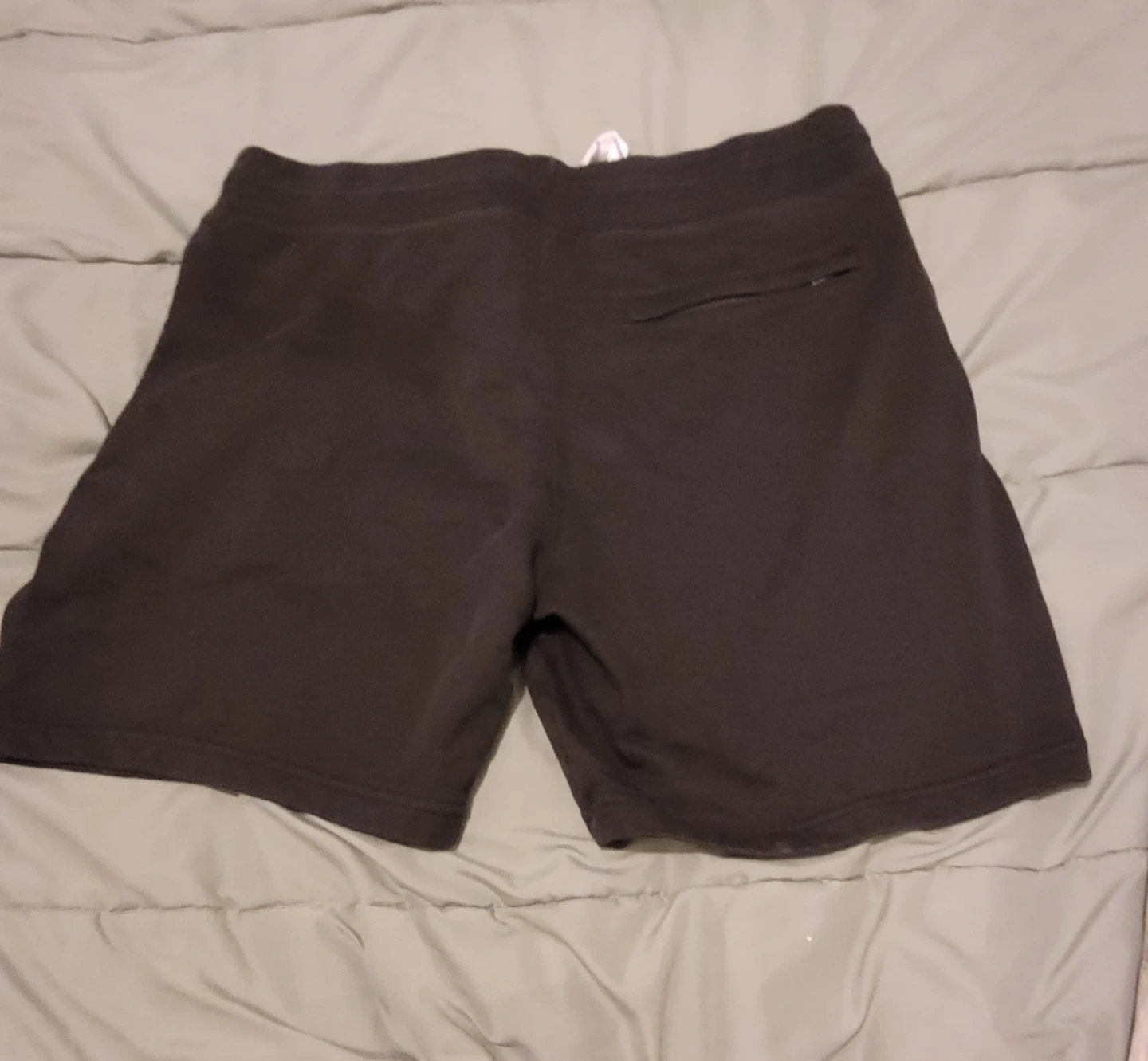 Psycho Bunny black sweat shorts with pink embroidered logo. Elastic waistband with drawstring. Two side pockets and one back pocket. Waist measures 17 inches flat, inseam measures 10 inches.