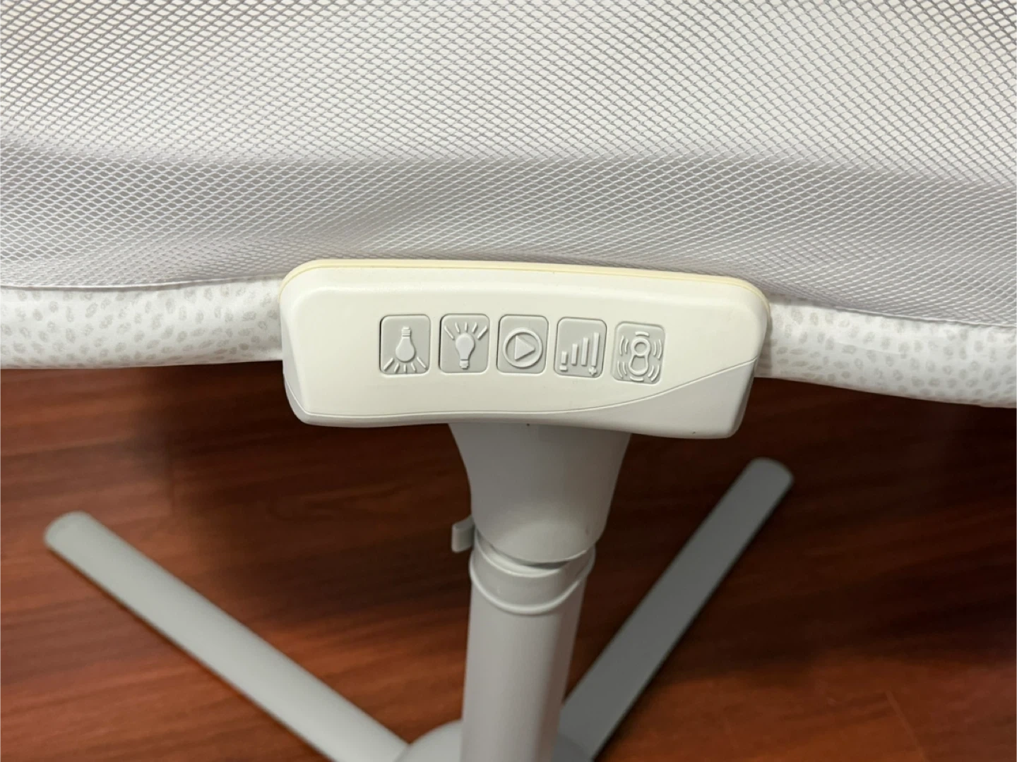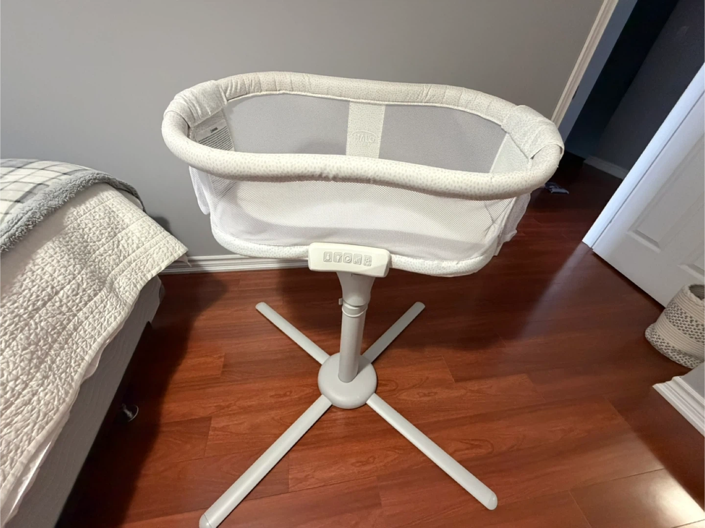 HALO Bassinet swivel sleeper for babies. Features mesh sides for breathability and a stable base. It has storage pockets on both sides. Built-in white noise, nightlight, and soothing vibration movement settings.