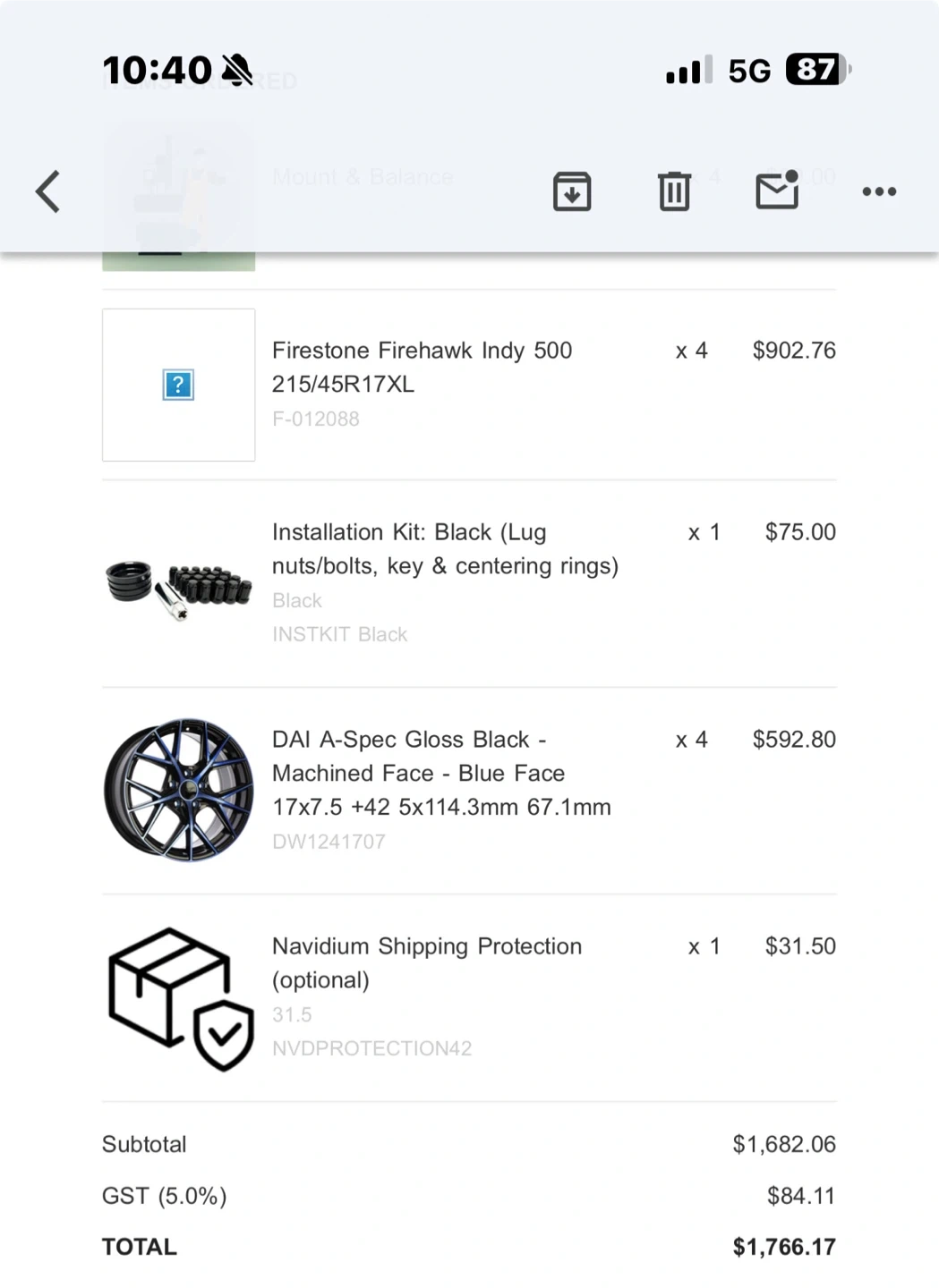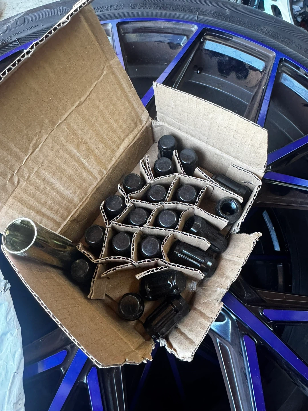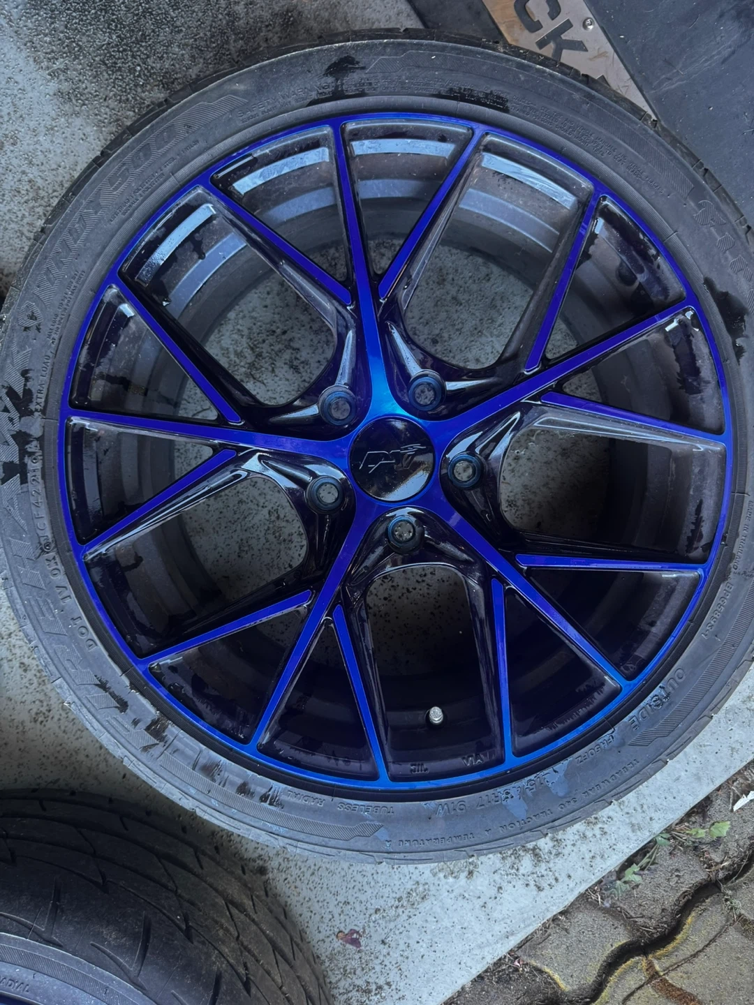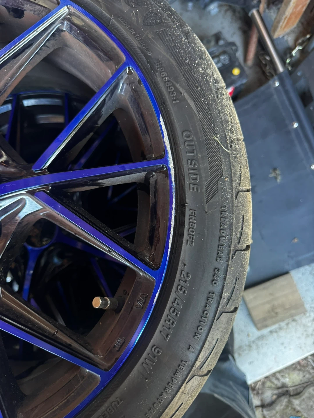 Set of tires with 17-inch rims. The tires are 215/45R17 91W. Rim size is 17 inches with a blue accent. Lug nuts included in original packaging. Indy hawk tires are basicly brand new maybe 150 km on them some curb rash see photo