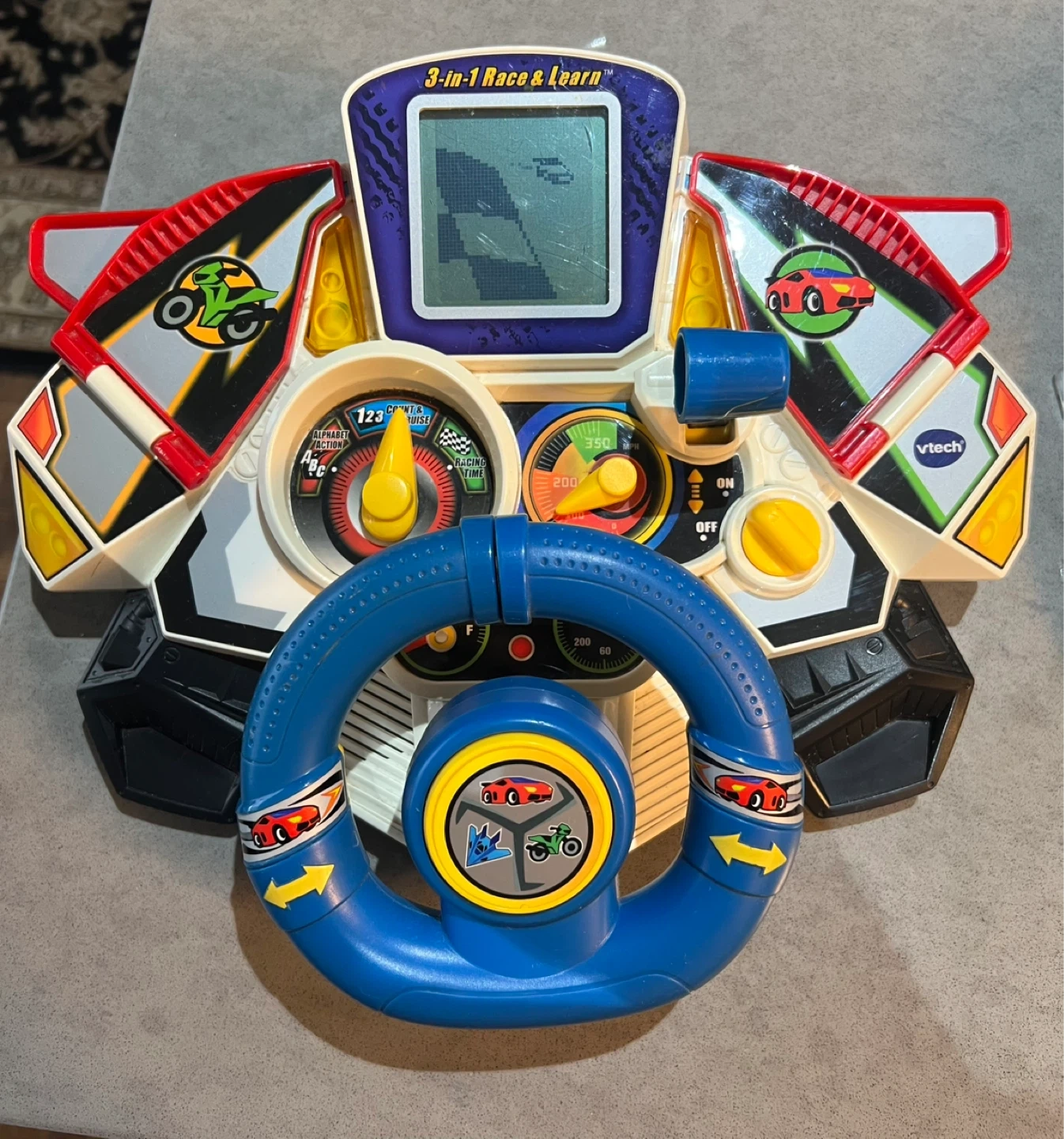 VTech 3-in-1 Race & Learn steering wheel toy for kids. Features a colourful screen and interactive buttons for racing games. Requires batteries for full functionality.great condition