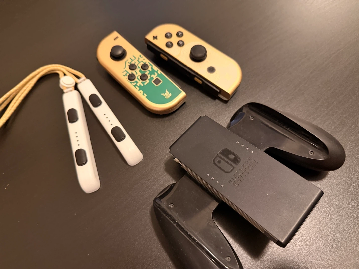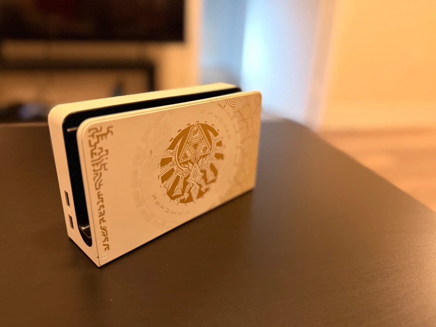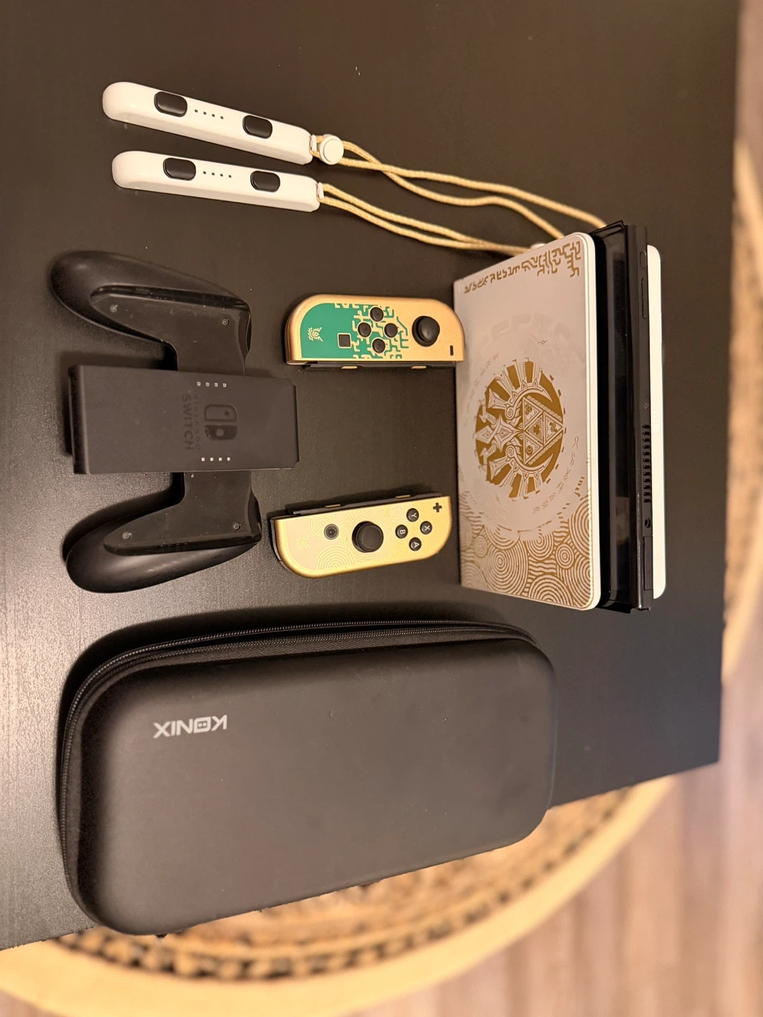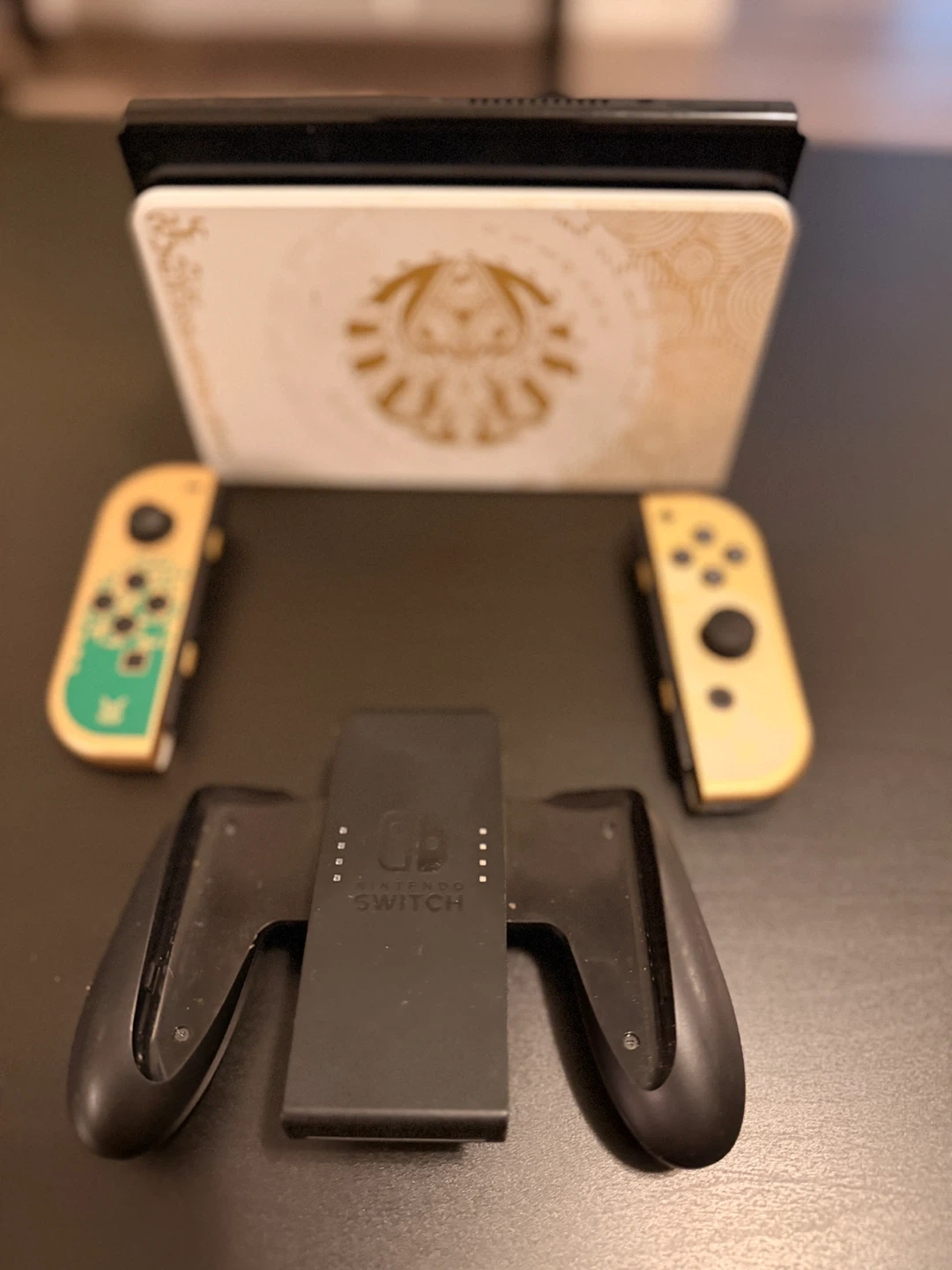 This Nintendo Switch console features a special edition Legend of Zelda themed dock. It includes a pair of gold Joy-Con controllers and a charging grip. A carrying case and all connecting cables are also included.