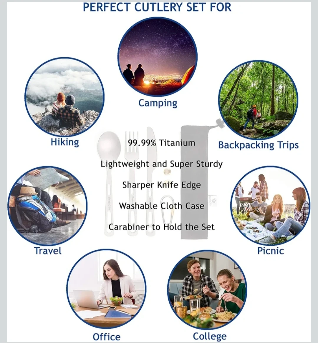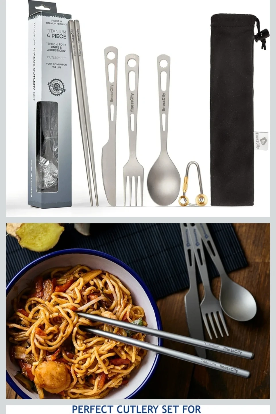 This is a 4-piece titanium cutlery set. It includes a spoon, fork, knife, and chopsticks. It's lightweight and comes with a washable cloth case and carabiner.
