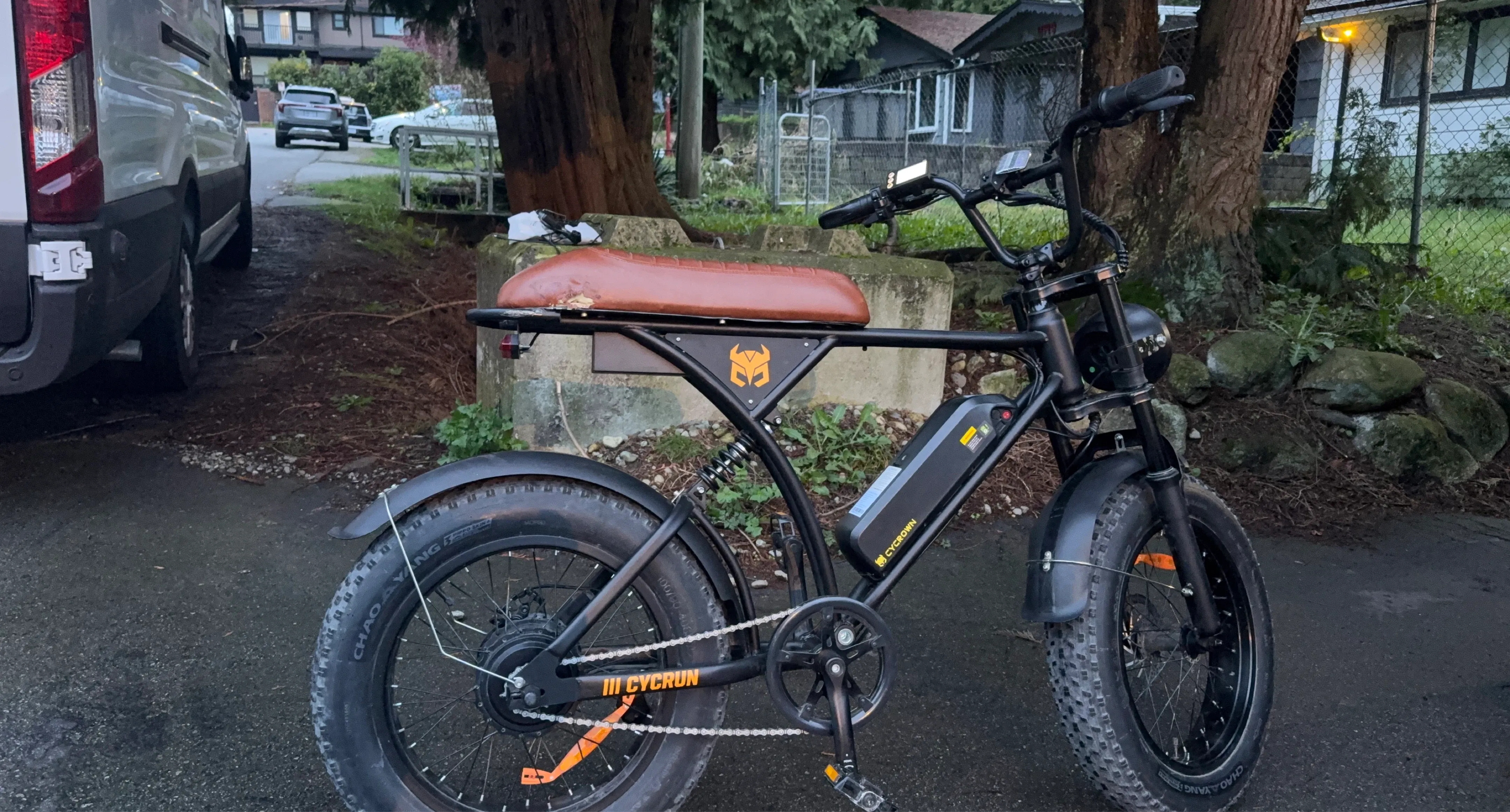 This is a CYCROWN electric bike with a brown seat. It features fat tires and a black frame. The battery is removable. It’s in a good condition like new just 775km on it. Highest speed is 32km and it can cover up to 90km in a full charge. Just little bit sear is torn out from the side. Or else it’s ready for the road. Coles with a battery key, charger and tool kit.
