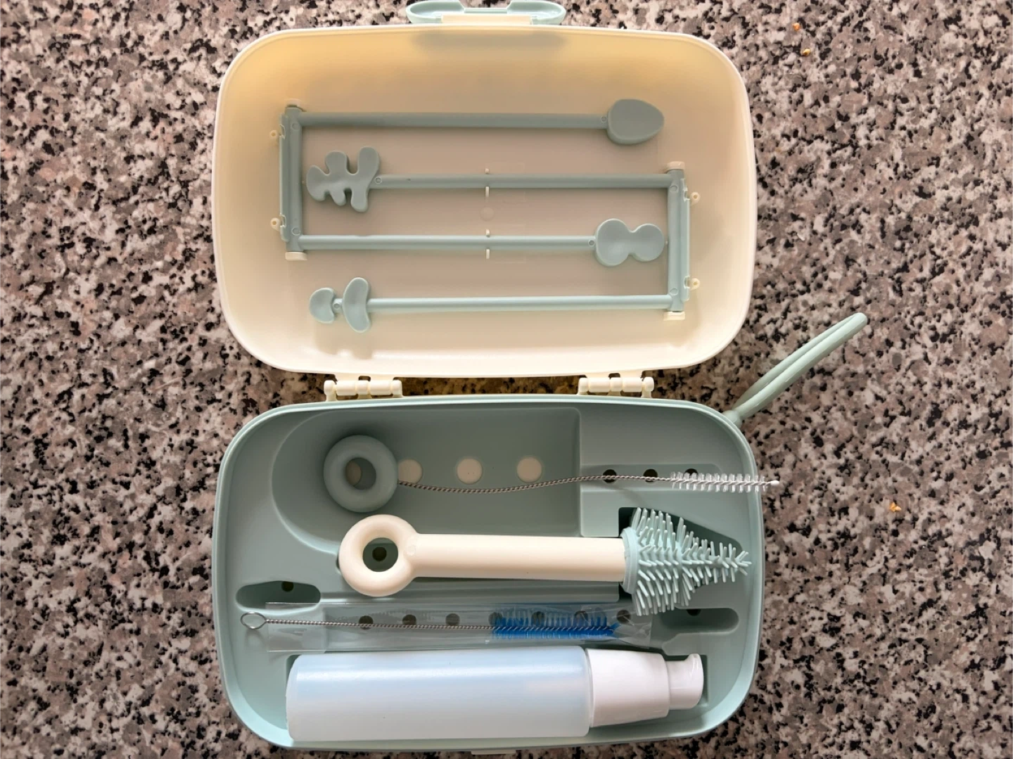This Momcozy set includes a variety of brushes for cleaning baby bottles and accessories. It comes with a portable case for easy storage and travel. The set has a bottle brush, nipple brushes, and straw brushes.