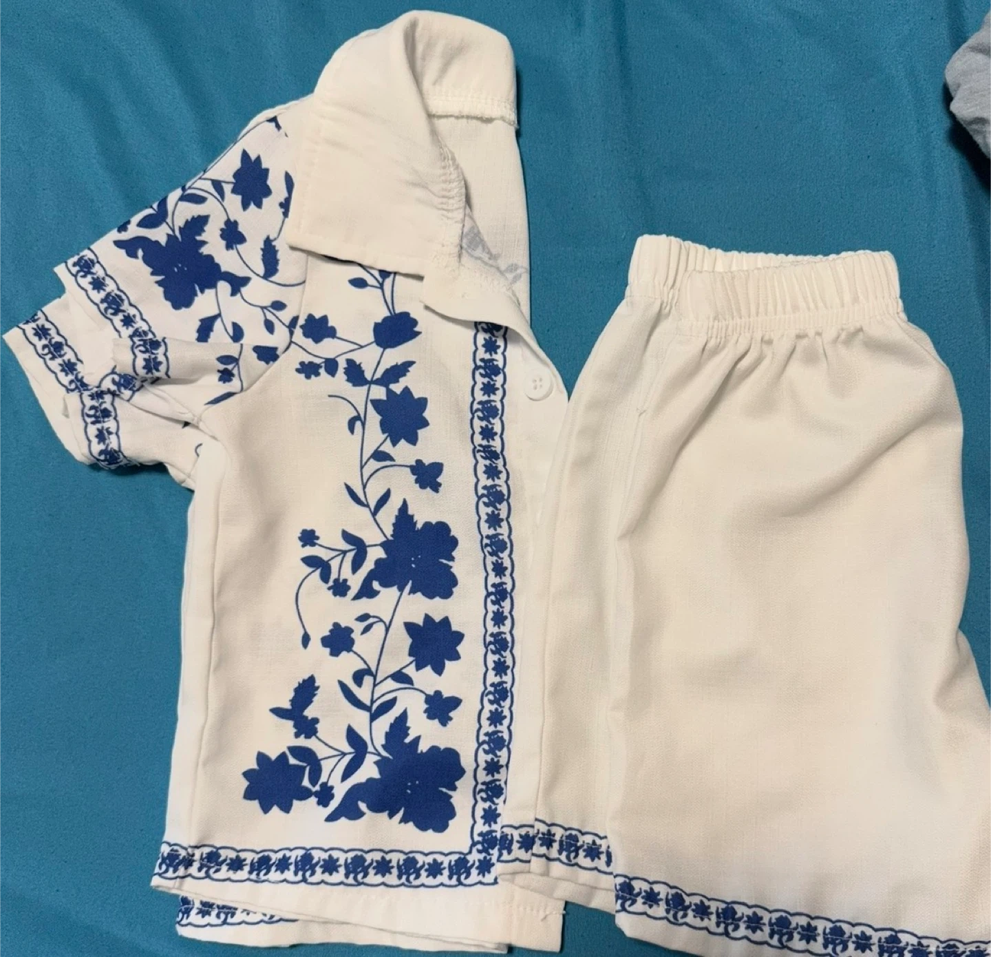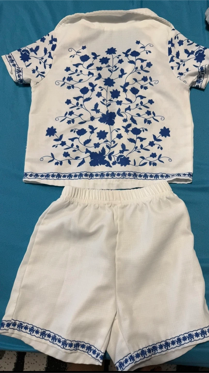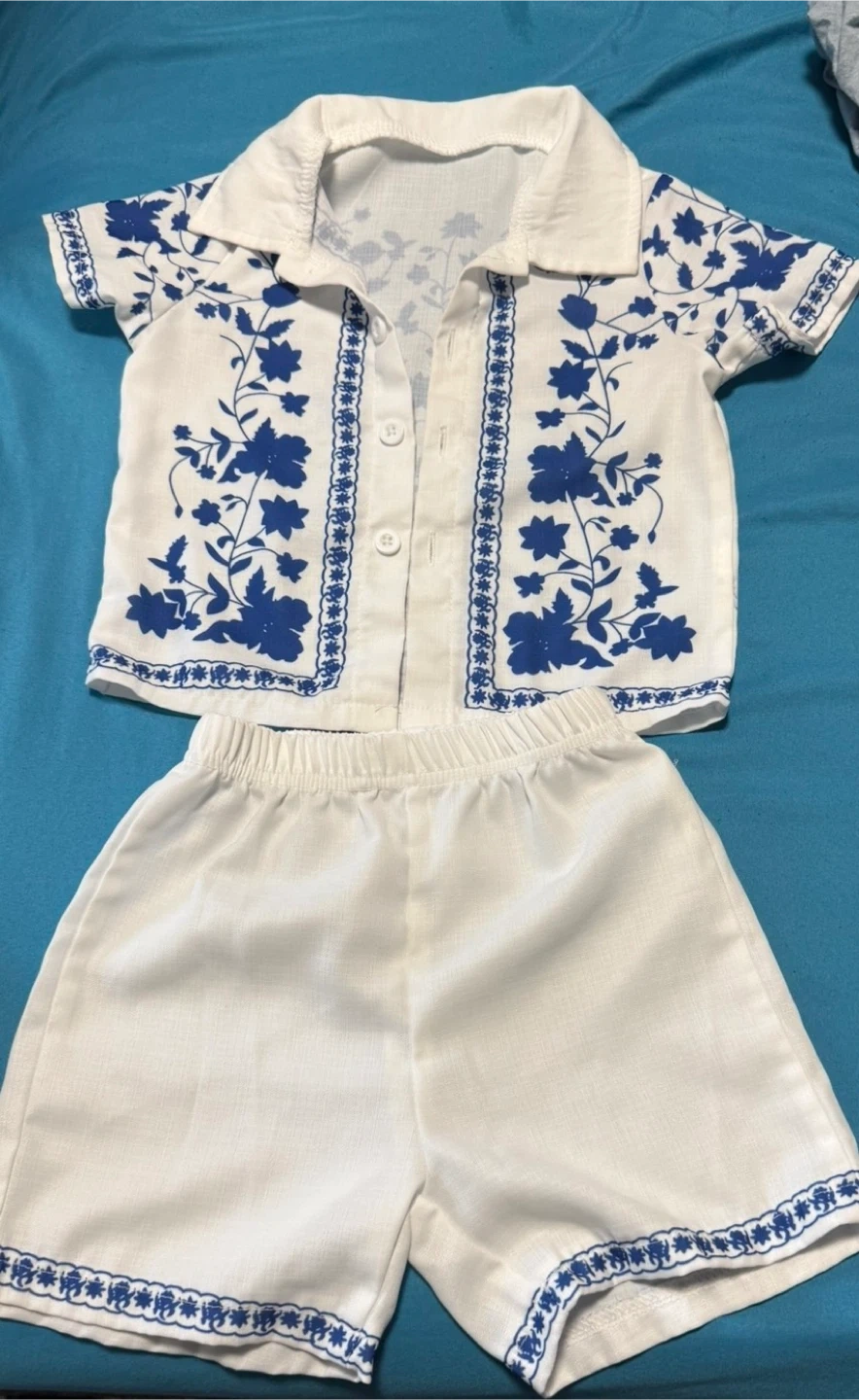 This cute set includes a short-sleeved button-up shirt and matching elastic waist shorts. Both pieces have a white base with a blue floral pattern and decorative trim. Great for warmer weather!
