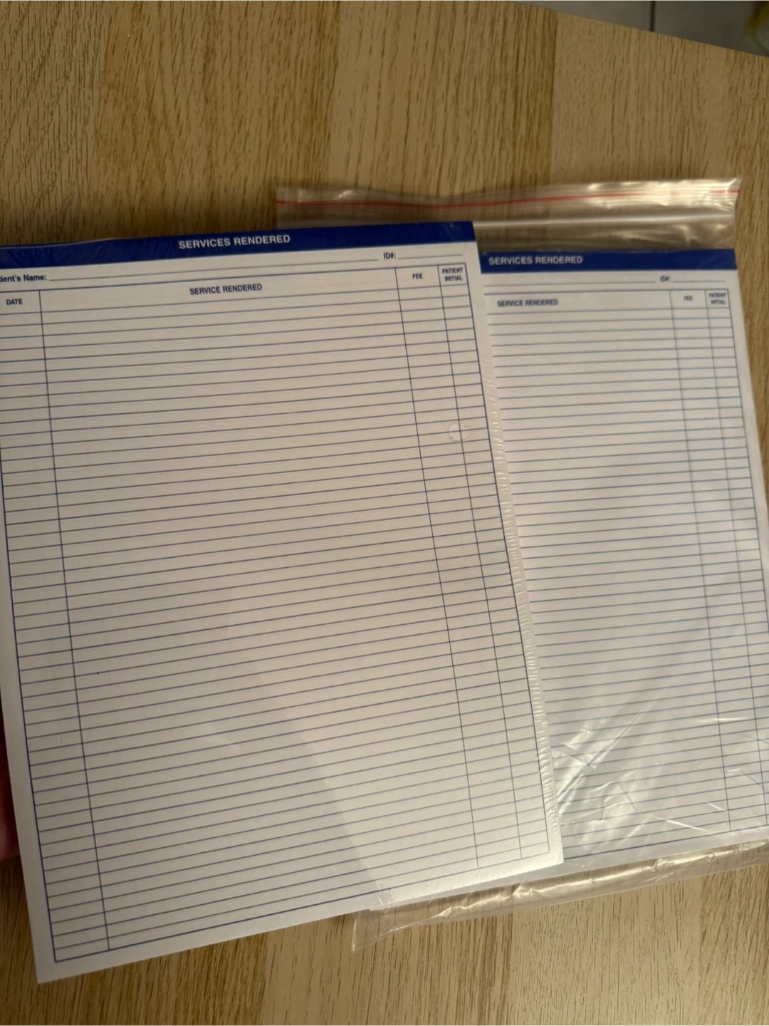 These are Services Rendered forms. They're designed for tracking client names, dates, services, fees, and patient initials. Great for small businesses or independent practitioners! Each sheet is lined for neat record-keeping.