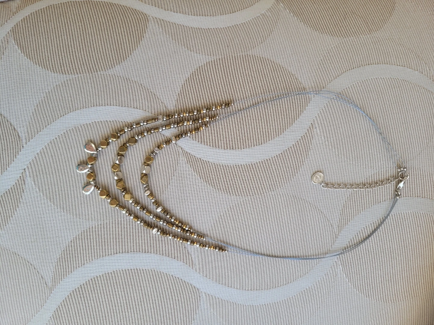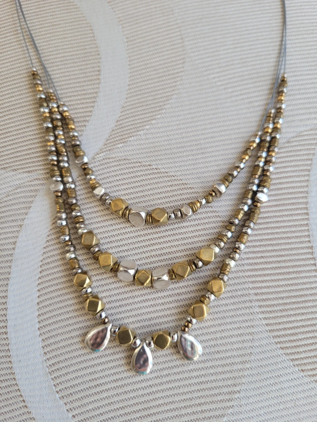 This is a Silpada 16' Sterling Silver three-strand wire bronze beaded necklace. It features a lobster clasp closure with a 2' extender chain. The beads are a mix of cube, teardrop, and round shapes.Boho style.