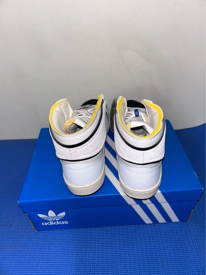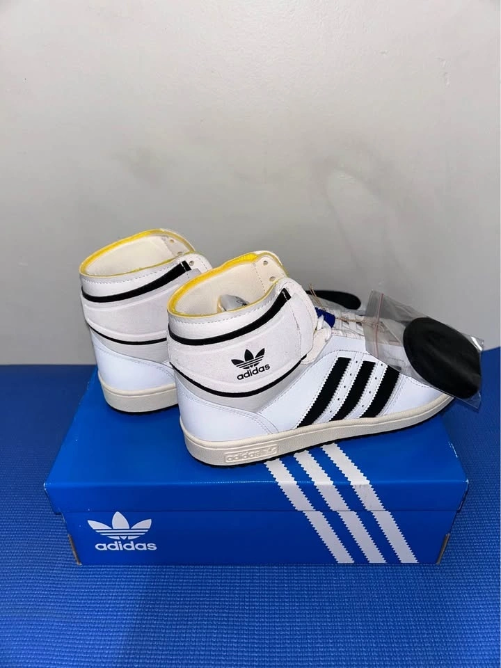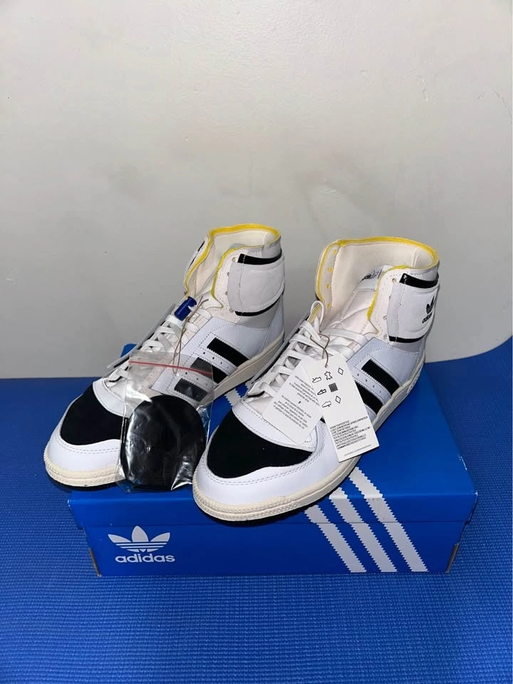 Fresh Adidas Top Ten high top sneakers. White, black, and yellow colorway. New in box with tags still on and extra black laces.