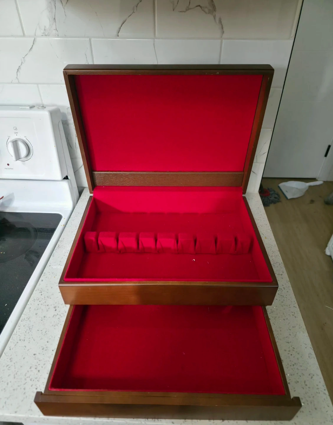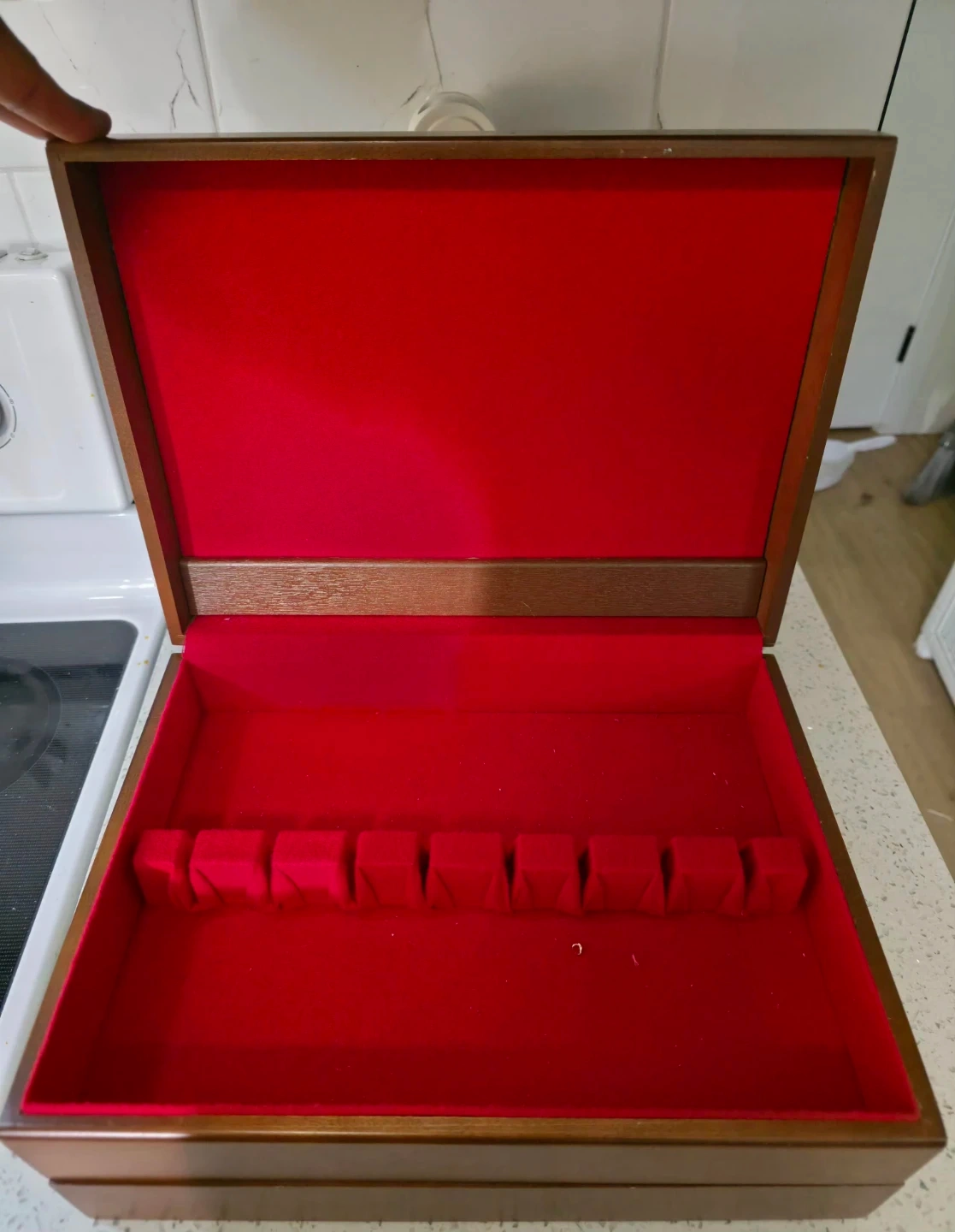 Selling a lovely wooden jewelry box! It features a rich, red velvet interior perfect for keeping your treasures safe and organized. The box has a classic design that would look great on any dresser or vanity. It's in great condition and ready for a new home!