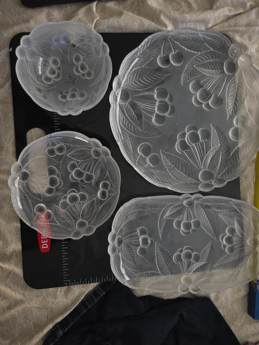 This set includes eight beautiful frosted glass pieces featuring a detailed cherry and leaf design. It consists of two round bowls and two platters and 4 plates. These decorative serving dishes would add a lovely touch to any table setting.