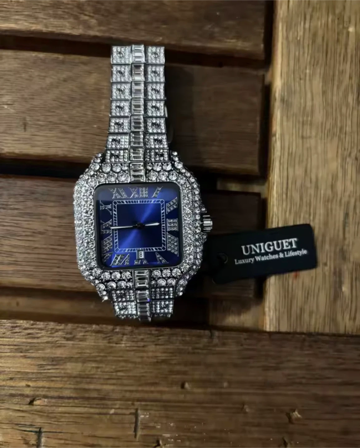 This Uniguet watch features a square face with Roman numerals and a date display. It's fully encrusted with sparkling stones. It comes with its original box and packaging.
